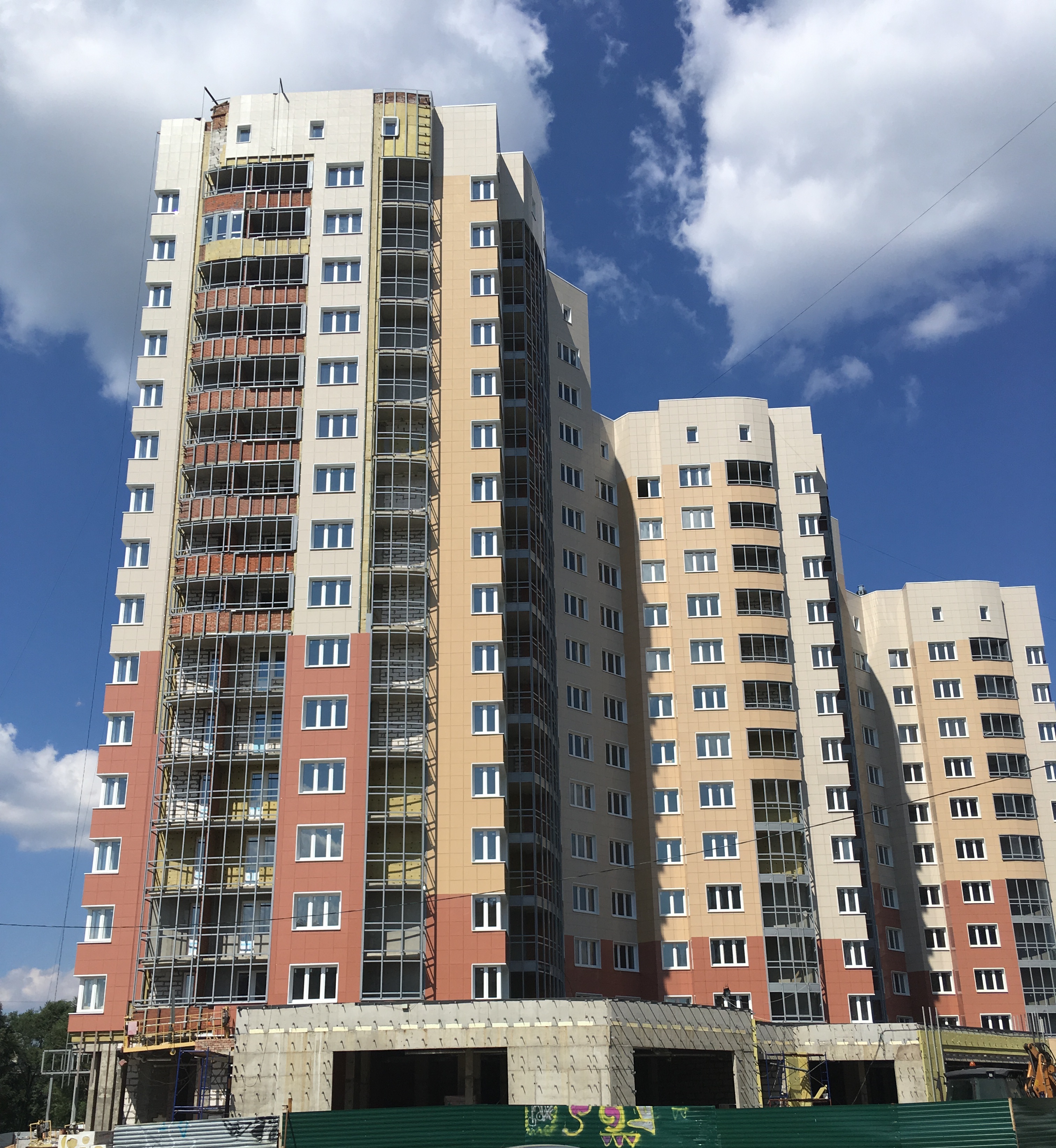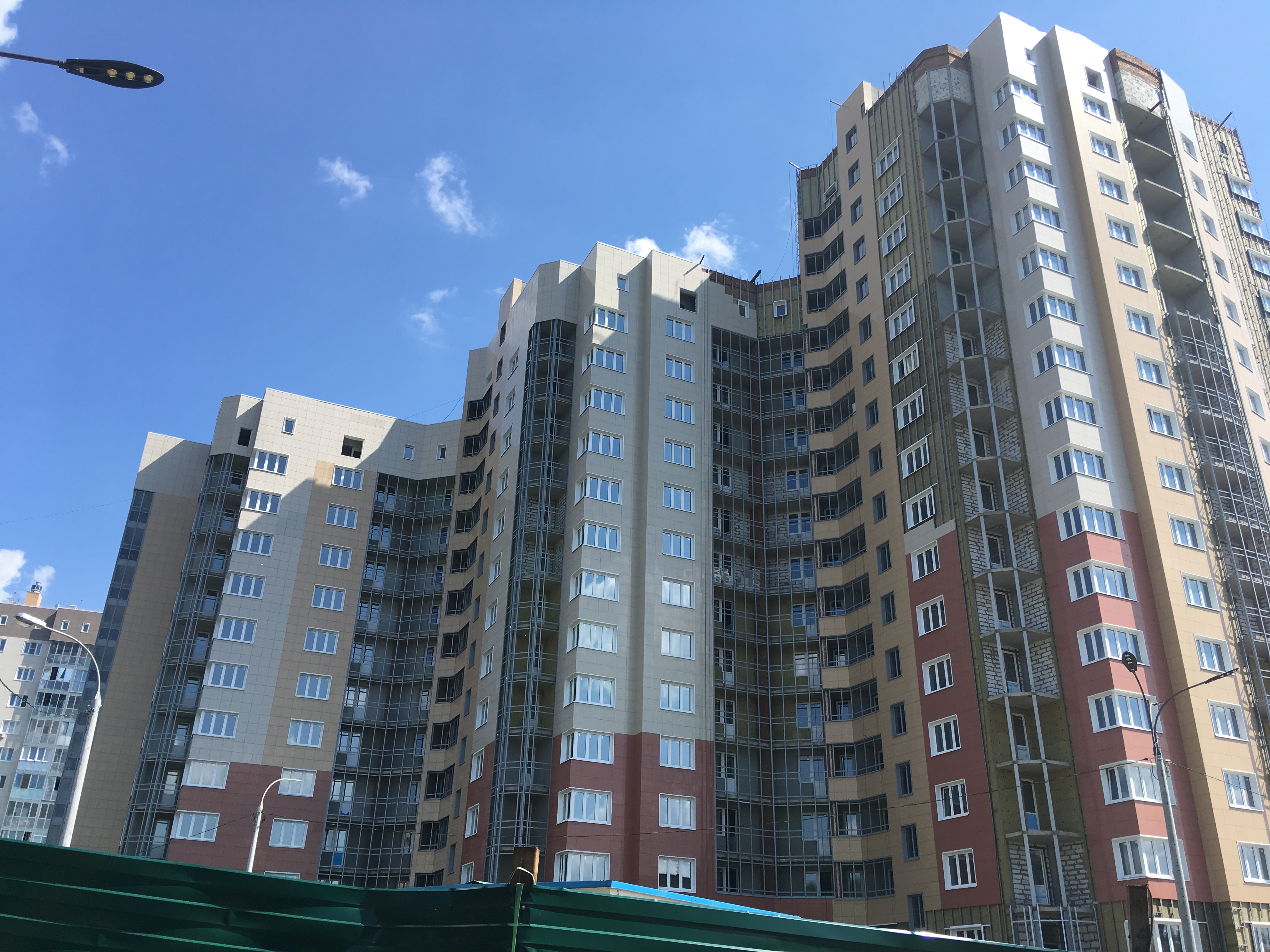 Всё да не всё. Половина балконов/лоджий не отштукатурено, остекления тоже мало где, где-то даже нет каркаса для остекления. И главное в 13:30 пятница - ТИШИНА, обед наверное. Или жарко, работать не можем.