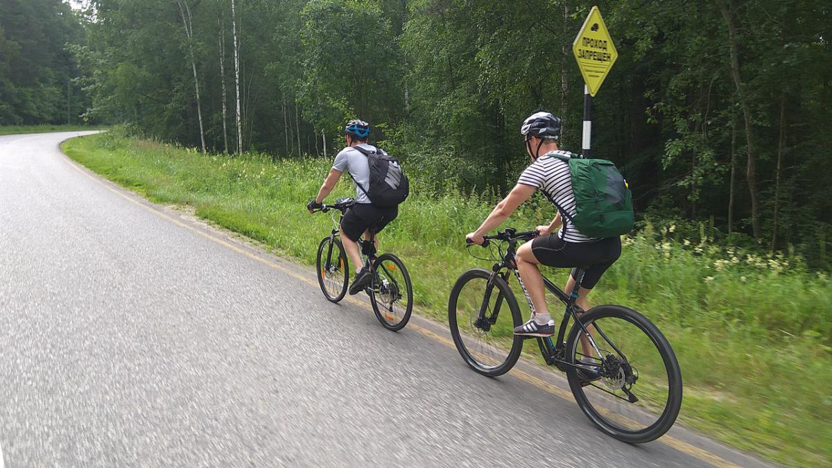 Следующая тридцатка тоже была несложной, правда на ней нам попался странный участок дороги в населённом пункте "Малюшина Дача". Карта почему-то вела нас в объезд деревни через лес, хотя на территории "Дачи" был хороший асфальт. Когда мы приехали туда, оказалось, что перед въездом в эту деревню стоит знак "Кирпич", висят таблички "Въезд запрещён", а также камера видеонаблюдения... Но никаких заборов, шлагбаумов, постов охраны, ничего не было. Мы решили, что это неплохое место, чтобы устроить привал и немного перекусить . Пока мы ели, в этом месте не прошло ни души. Немного не доезжая до него, мы обратили внимание на корпуса за забором слева от дороги, там была старая детская площадка, всё было заросшее травой. Как мы поняли, это был пионерский лагерь, и, судя по всему, он был заброшен. И вот, доедая бутерброд, где-то со стороны этого лагеря мы услышали дикий вой. Что это был за вой, сказать трудно. Сначала показалось, что это одновременно завыла стая волков, затем, этот звук как будто перерос в крик домашнего скота, потом и вовсе почудилось, что он начал приближаться. Но мы так никого и не видели. Впрочем, звук как неожиданно начался, так неожиданно, где-то через минуту, резко и закончился. В этот момент мы все одновременно решили, что самое время ехать! Но куда? Объезжать по лесу мы не горели желанием, а ехать по асфальту под кирпич и камеру было на самом деле как-то стрёмно. Кто знает, что там дальше? Может там сидит снайпер и только и ждёт, как мы переедем черту знака? Возможно, это кажется абсурдным, но в тот момент мы думали действительно так. Потому что, судя по карте, дальше была вертолётная площадка, а за ней карта не грузилась и вовсе... Казалось, что эта территория выкуплена полностью каким-то олигархом, который плевать хотел на закон и дальше на этой территории может твориться полный беспредел... В итоге, мы решили забить на все запреты и поехать под кирпич. Уж если что, вернёмся. Мы проехали метров 200, на которых висело в сумме ещё порядка 10 табличек "Въезд запрещён", "Территория с/х назначения" и т.п. Энтузиазм ехать дальше по этой дороге уменьшался, как вдруг, мы упёрлись в бетонные блоки, между которыми висел металлический трос с красной лентой, где были слова "Запрещено". Но и это нас не остановило, мы перекинули велики и поехали дальше. Мы проехали пустую вертолётную площадку. Проехали ещё пару сотен метров и дорога закончилась! Дальше просто рос лес! Что делать, мы пока не знали. Мы вернулись чуть-чуть назад, там был поворот направо. Мы решили заехать туда. Поворот вёл на бугорок. Поднявшись на него, мы увидели выкошенные поля с фонарными столбами и освещением. С уличным освещением, в какой-то глуши, где даже связи-то толком не было! Было странно... Мы решили вернуться обратно на дорогу, пока нас никто не засёк. Карта говорила, что если пройти немного по лесу в направлении дороги, мы выйдем на ту же асфальтовую дорогу, которая почему-то в этом месте была лесом. Действительно, после этого участка леса, была дорога. Проехав по ней, мы выехали к каким-то не таким уж и страшным домам. В стороне паслась чёрная лошадь. Дальше началась уже нормальная дорога со знаками для машин. Тут мы поняли, что мы выехали с непонятной территории и дальше можно так не волноваться. Проезжая мимо домов, мы заметили, таблички с надписями "Домик для отдыха охотников". И тут нас осенило, чт