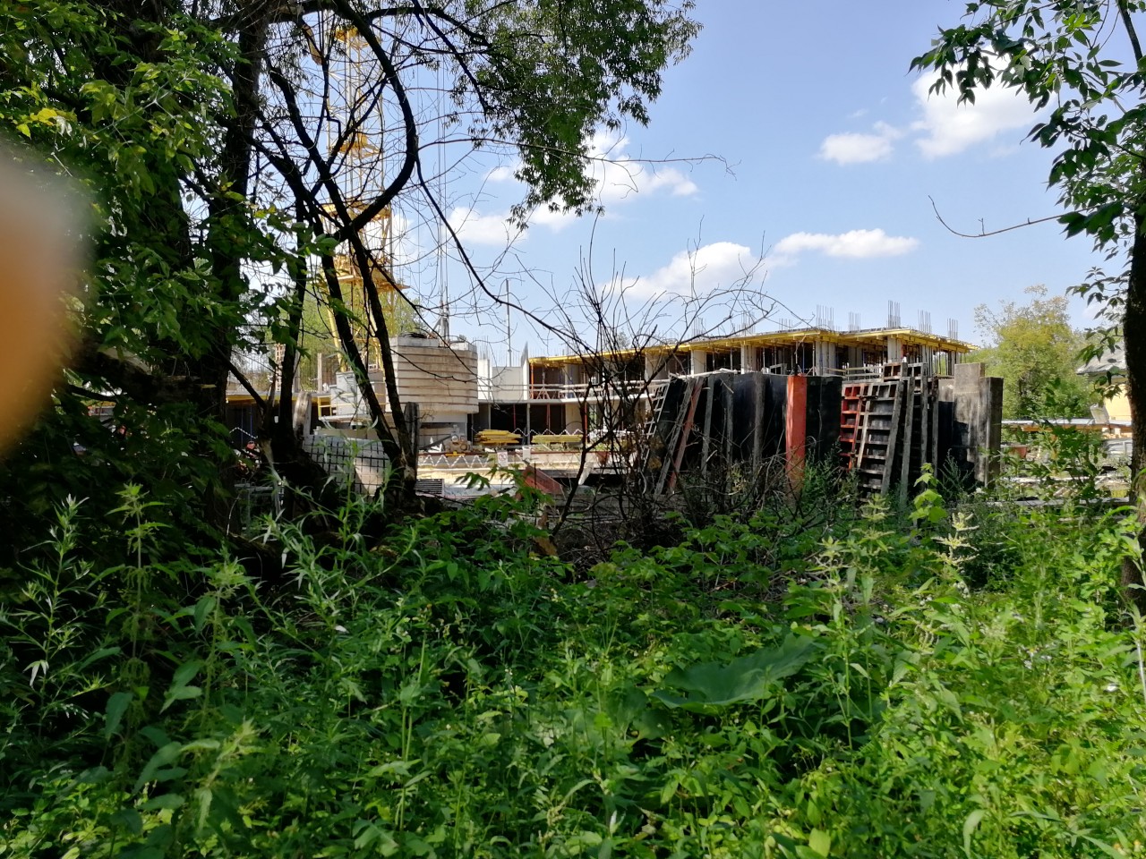 Сегодня видел шевеление на стройке. Рабочие ходят, грейдер стоит.