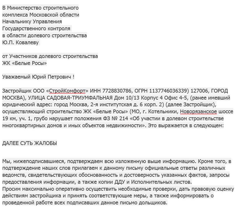 Сначала нужно написать то, под чем подписываться. А то действительно будет впустую потраченное время. Текст письма можно и тут согласовать.Анюта80 писал(а): ↑08 авг 2018 07:45 Для тех, кто невнимательно читает повторюсь, что собирать "огород", "тереть" пустое и тратить свое драгоценное время никто не планирует. Но, чтобы поставить подпись под коллективный обращением, нужно всё таки подойти лично. И для обращения в администрацию и минстрой никакой юрист не нужен, просто грамотно составляется письмо. Такими темпами, господа, вы ничего не добьётесь. Согласовываем дату, кто захочет придёт и под пишется.