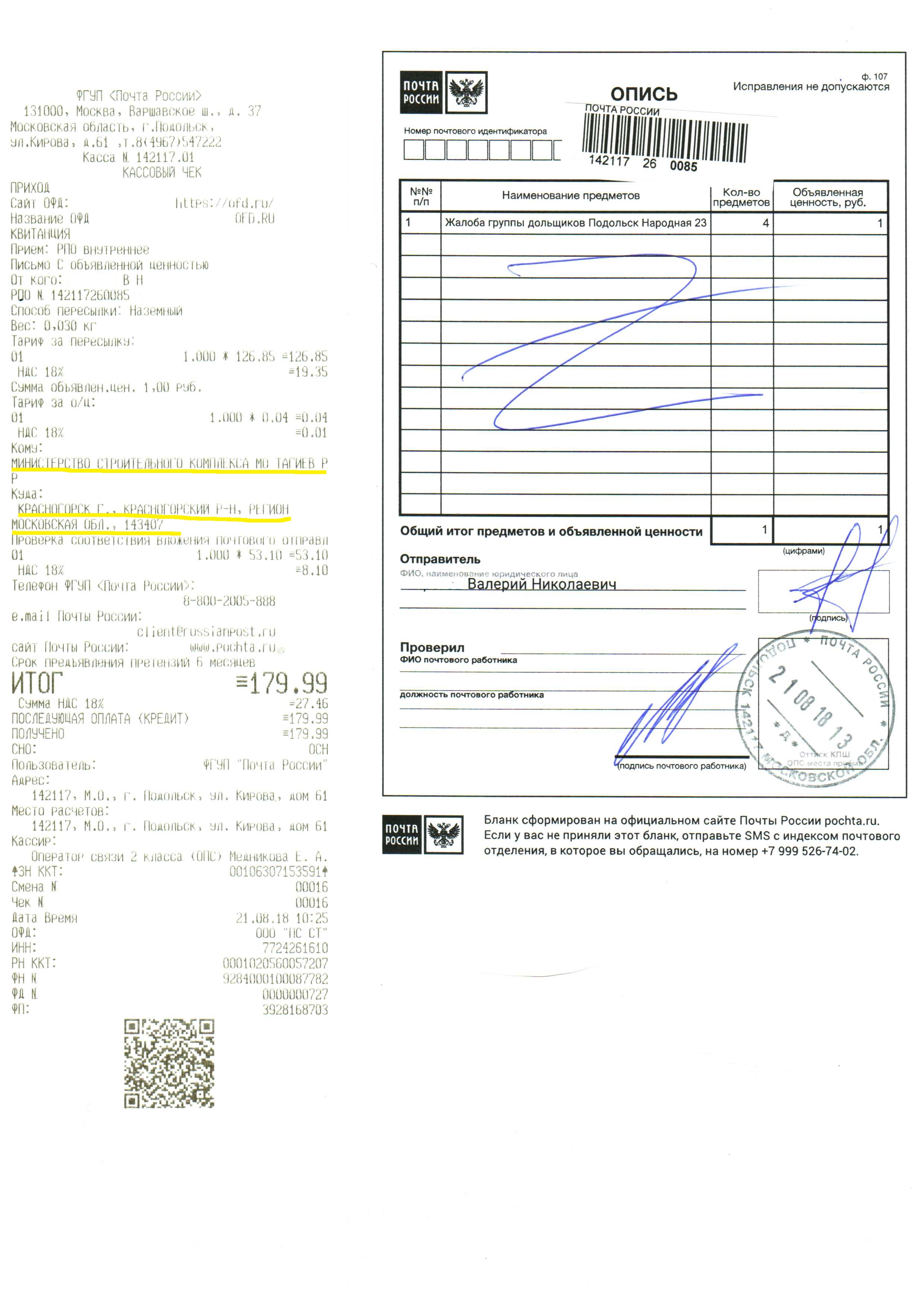Завтра 21.08.2018 год с утра письма отправляю почтой РФ заказным письмом с описью вложения