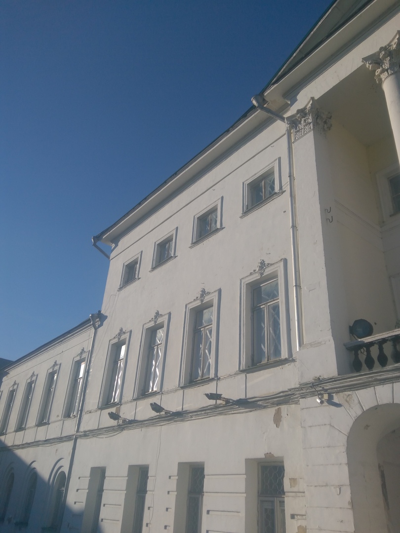 Обратите внимание на фронтон - здесь навесили декоративный элемент в виде эмблемы училища. Ещё очень острый вопрос - разрушения фасада здания домашнего театра! Декорации, пристроенные к главному корпусу, повредили фасад ( см. фото ниже, первое во вложении, где видно, как на усадебный фасад налеплен цемент с декорации)