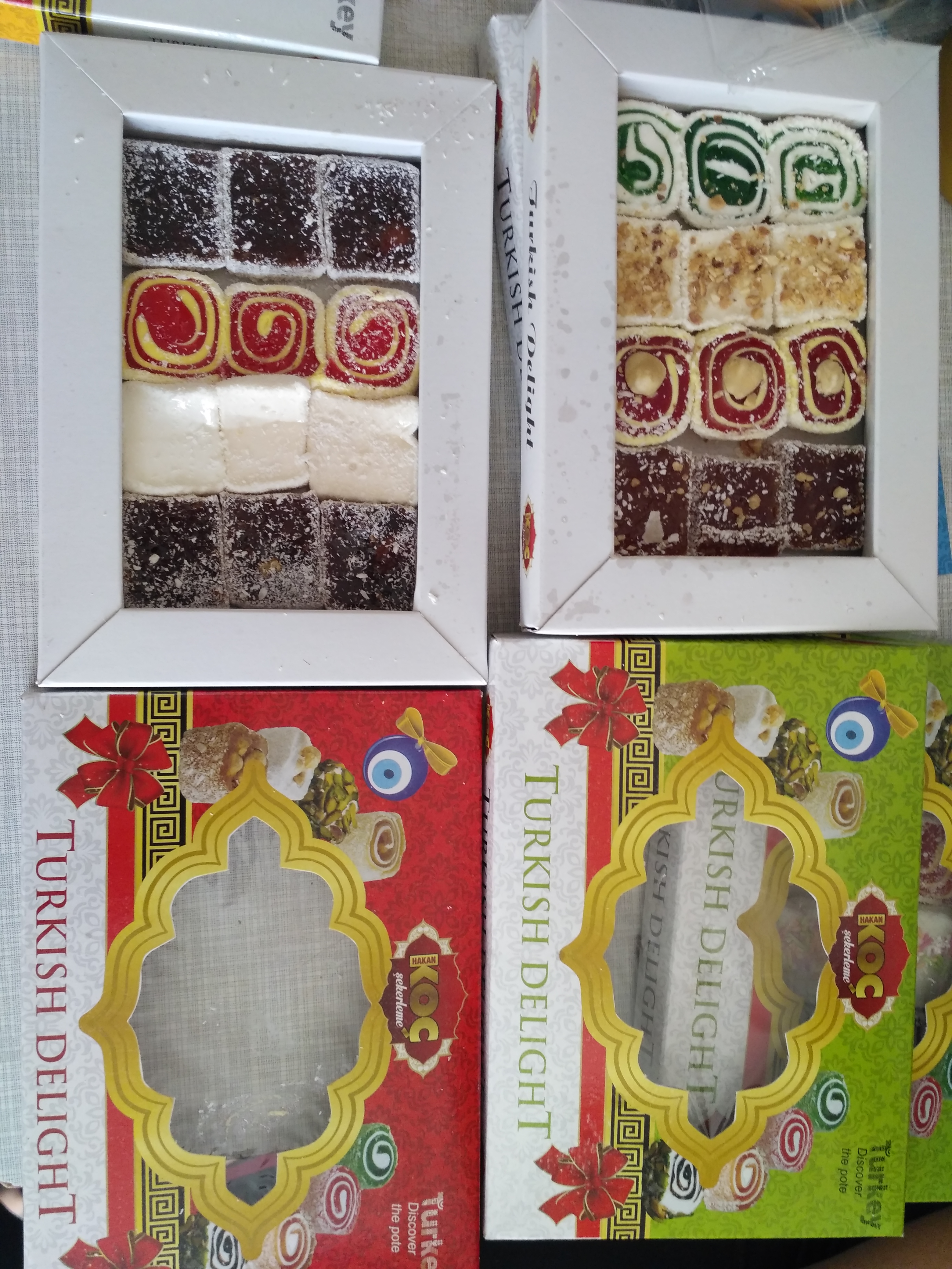 Вот лукум, который они массово продают по пять пачек, обвязанных ленточкой. На фотке справа это верхняя пачка, "презентационная", а левая пачка на фотке это нижняя упаковка, которую никак не проверишь