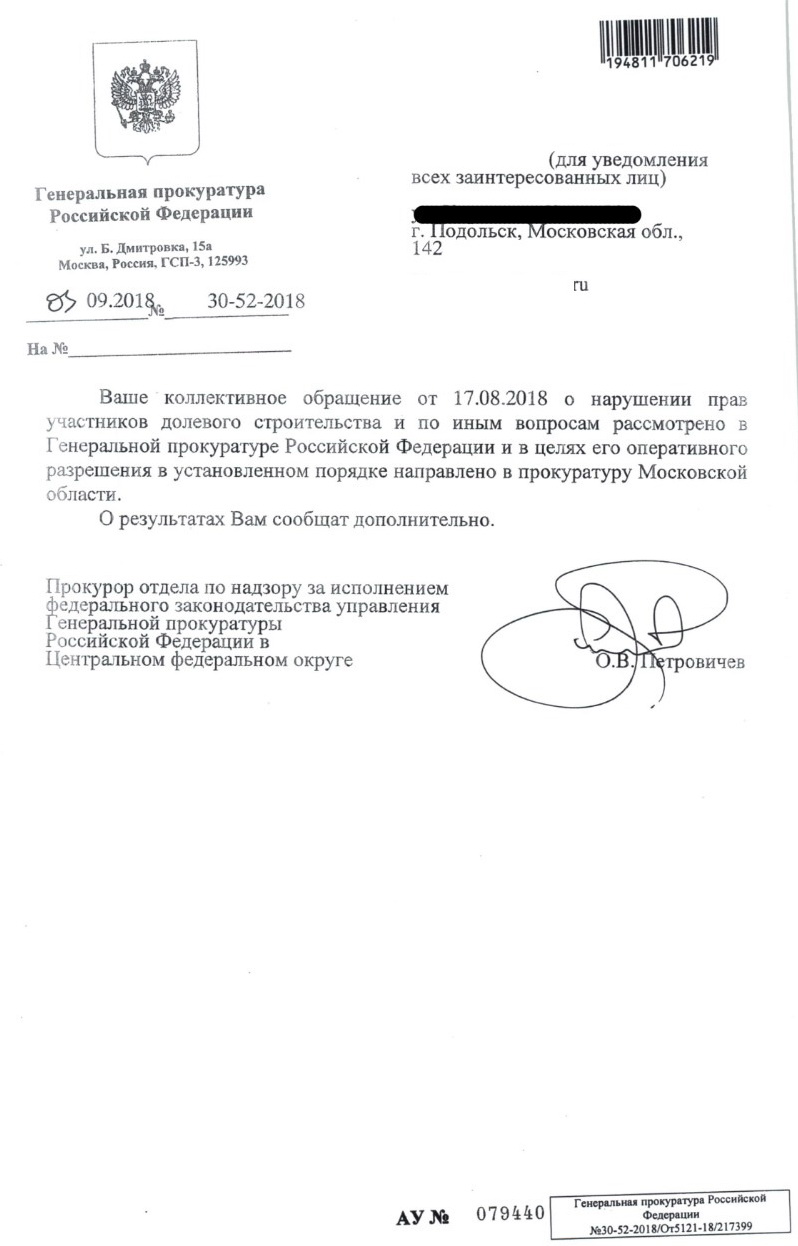 Генеральная прокуратура РФ, направила решение коллективного вопроса дольщиков Народной 23 в прокуратуру МО