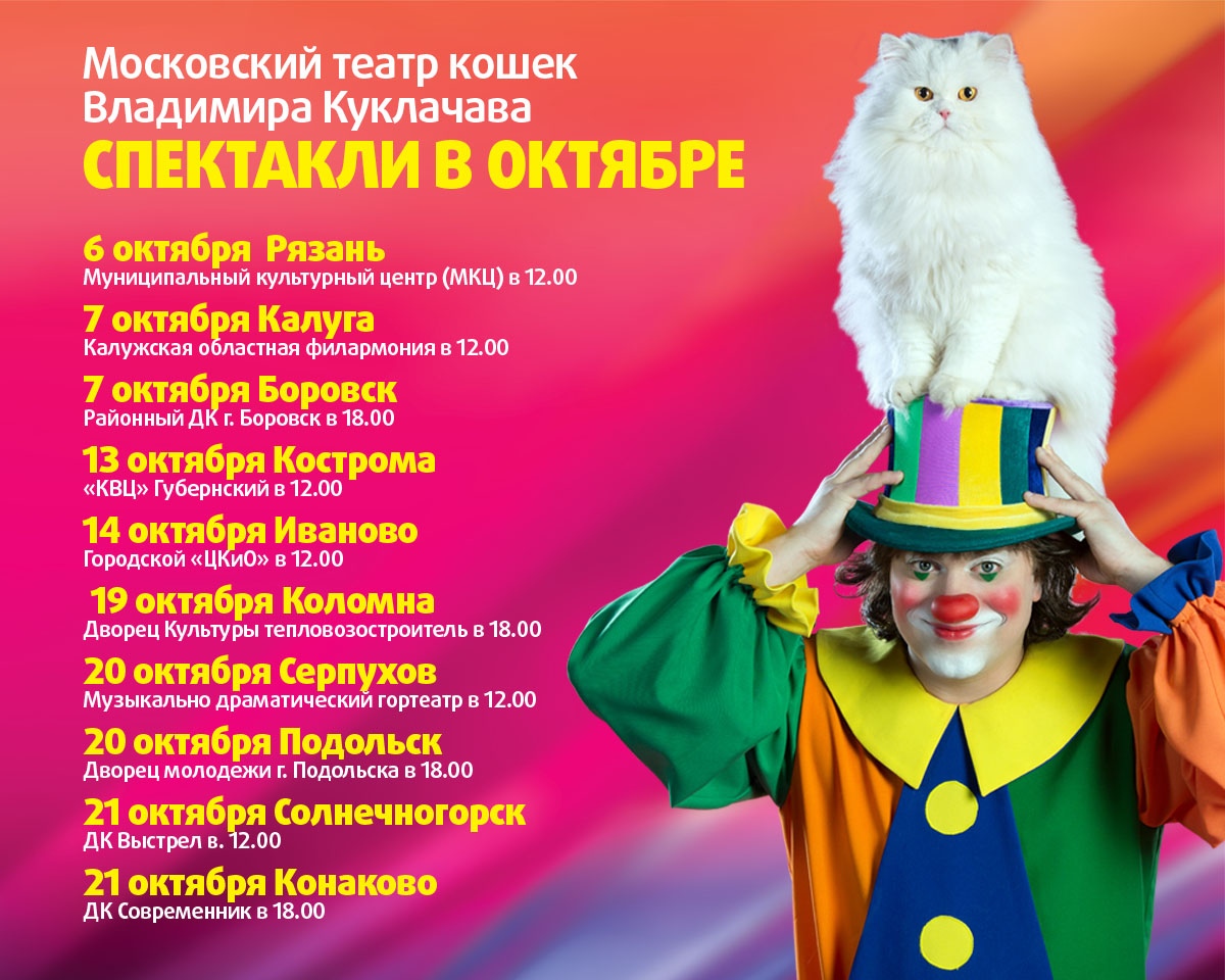 Узнала. 20 или 22 октября сын Куклачева с кошками приезжает в Дворец молодежи в 18.00. Цена 1000, 1200 и 1500