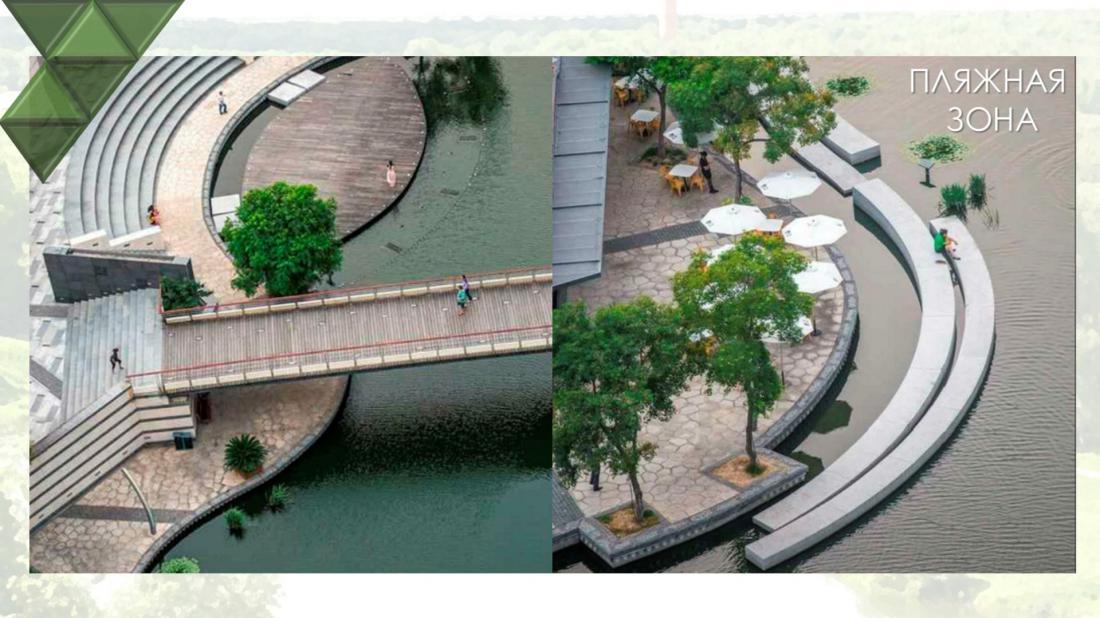 Принципиальной особенностью решения архитектурного и художественного облика парка является сохранение сложившегося живописного, природного Лесопарка, с лесистыми берегами, в сочетании с красивой водной гладью разлива реки Петрица.