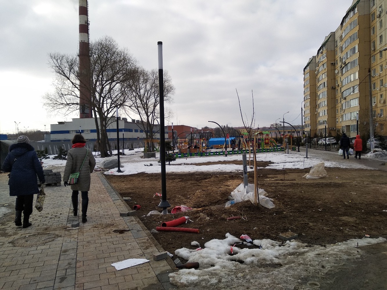 ­ земляные работы по устройству инженерных коммуникаций и установке электротехнических изделий (кабели электроосвещения и подсветки зеленых насаждений, кабели связи для обеспечения видеонаблюдения и Интернет, трубопроводы системы водоснабжения и канализация, поливочного водопровода, закладные детали фундамента для опор освещения, электрические распределительные щиты). Выполнено более половины работ, предусмотренных проектом.