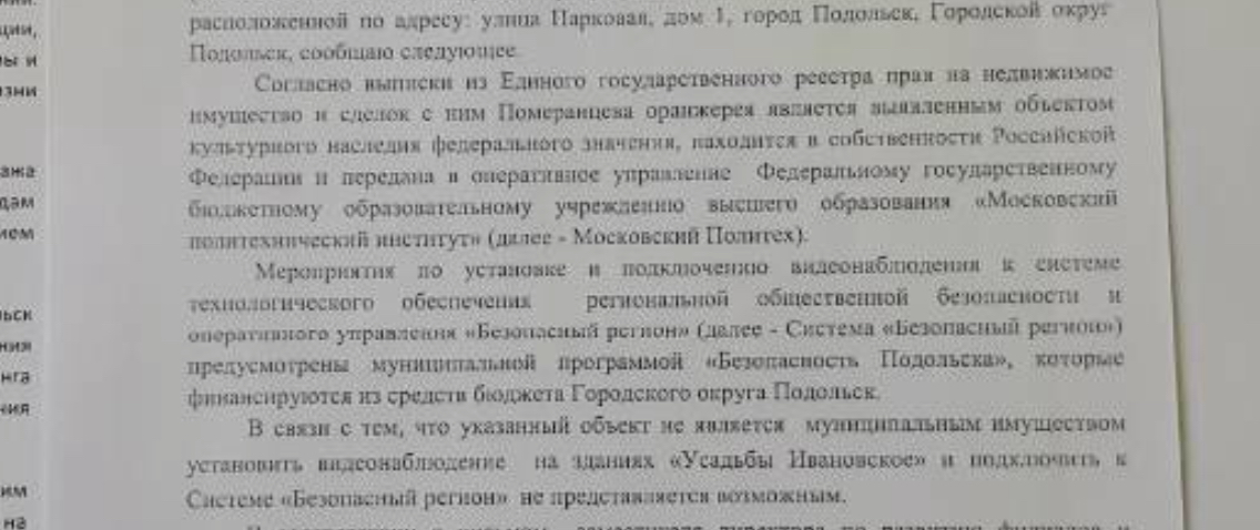 Сейчас пришла очередная чудовищная отписка из приёмной Пестова - на нашу просьбу установить систему видеонаблюдения в границах усадьбы по ряду причин, как то