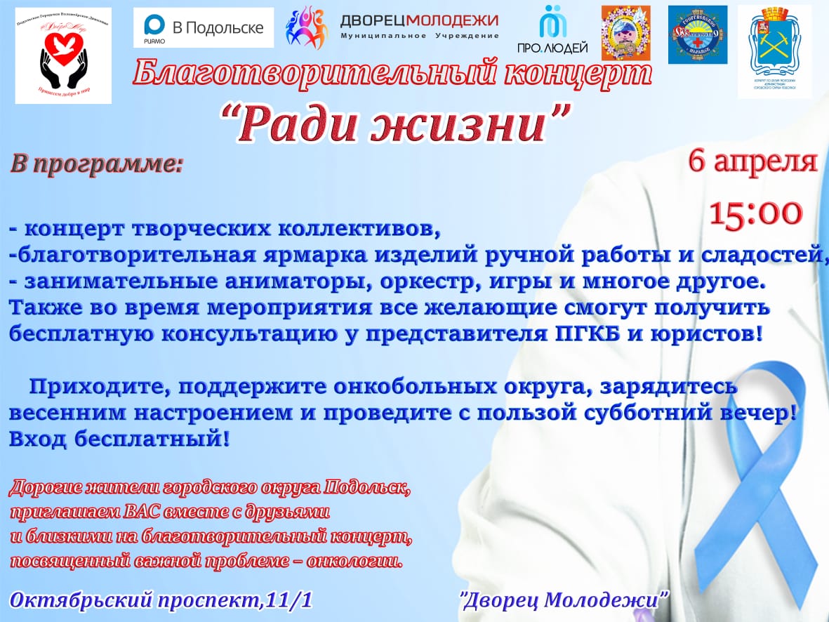 В преддверии Всемирного дня здоровья во Дворце молодежи Подольска 6 апреля волонтерское движение "Добромир" при поддержке комитета по делам молодежи администрации округа проведет благотворительный концерт в поддержку онкобольных Подольска «Ради жизни».