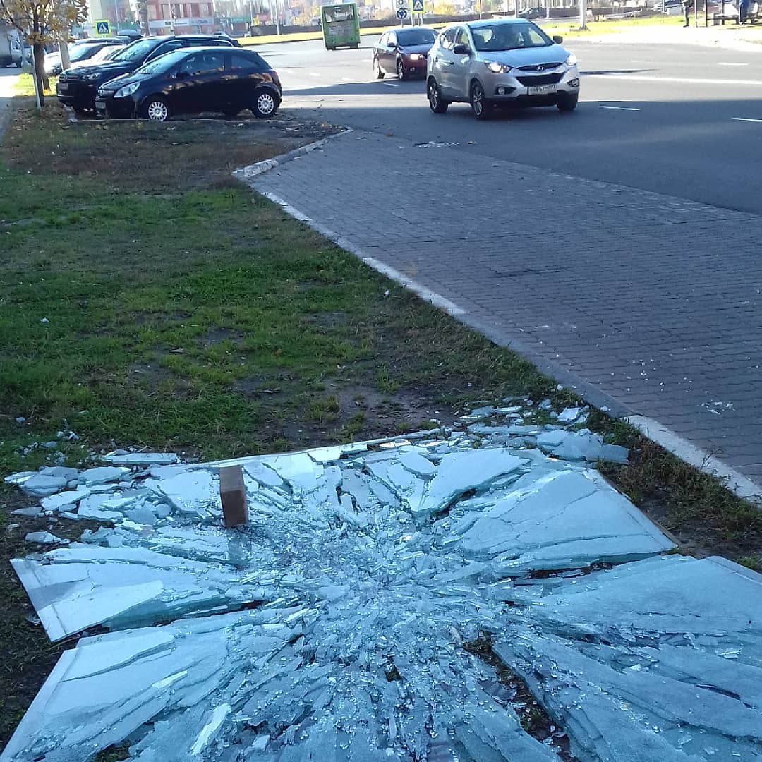 Разбитые стекла от старой остановки. Кто это делает? Дикость какая-то. Накануне поменяли остановку, а целые стекла оставили на земле. Надо было увезти их.