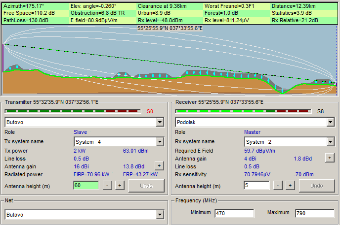 Результаты расчета трасс до ст. Подольск от Останкино и Бутово. Прием на комнатный логопер с Ку=4 дБи, высота 5 метров (2 этаж)
