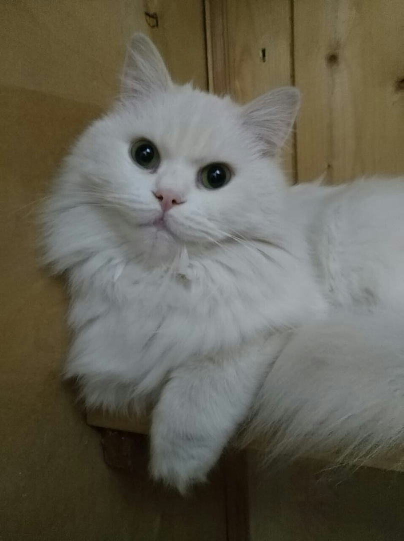 Похож на белое облачко. Котик домаший. Кастрированный. Ему 1,5-2 года. Общительный, добрый, совсем не царапается.