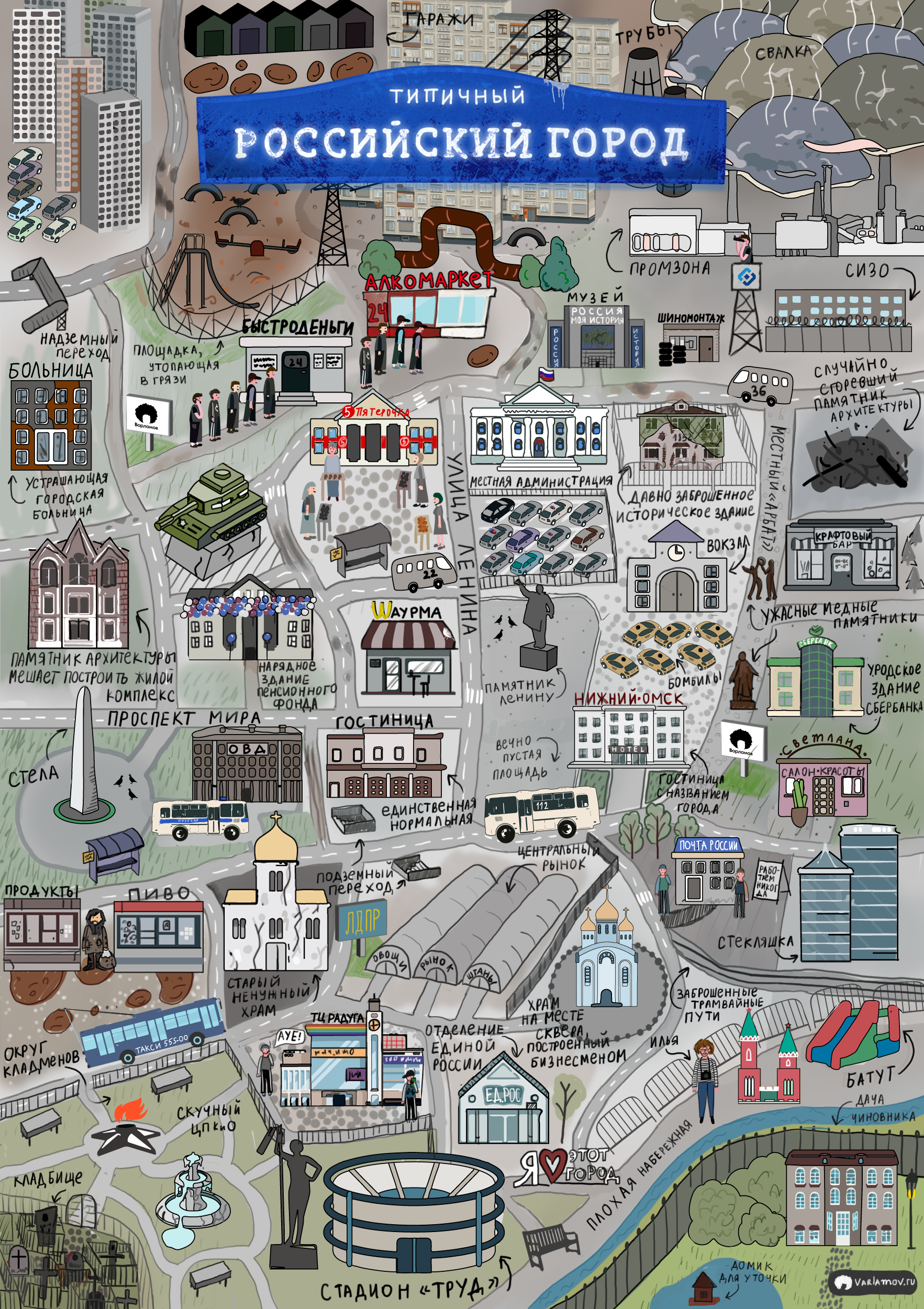 https://varlamov.ru/3175659.htmlКак я и обещал, мы с дизайнерами сделали более подробную, улучшенную версию "Карты типичного российского города". Вот что из этого вышло: