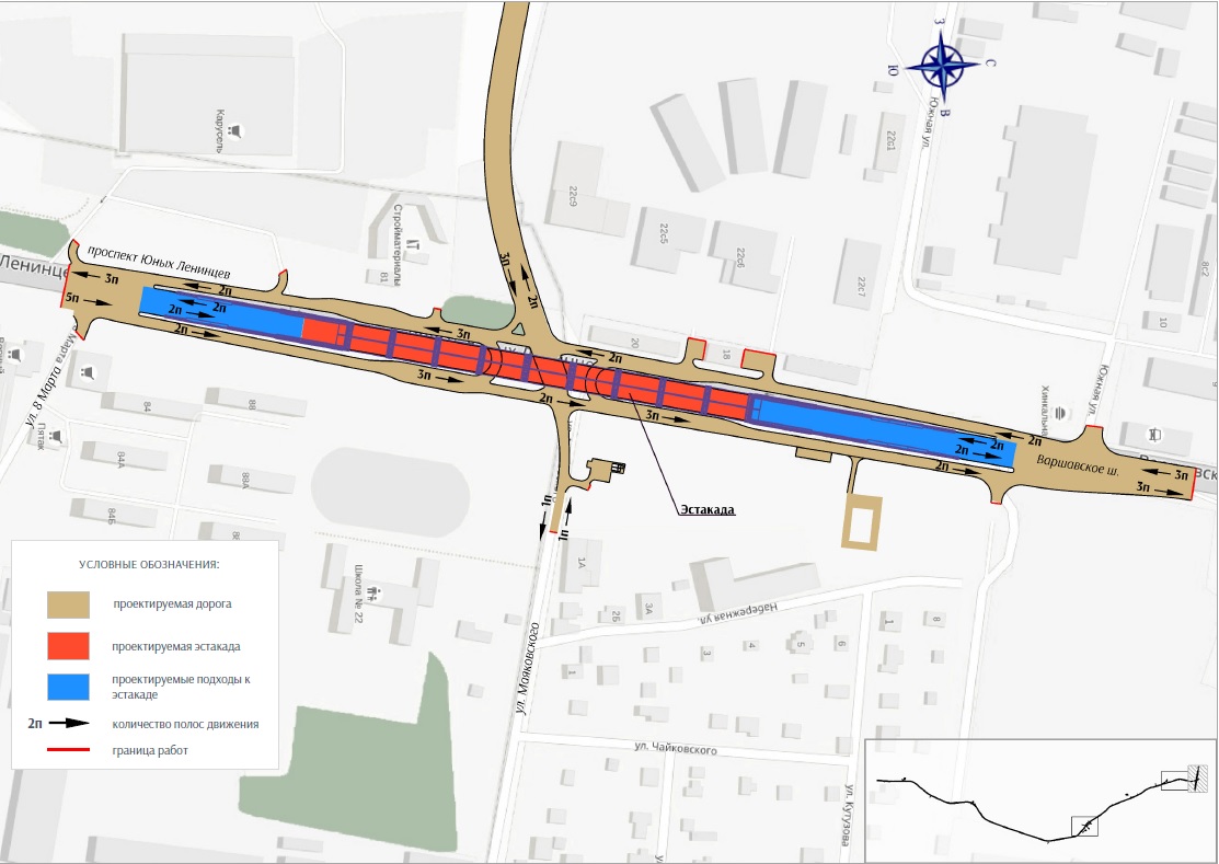 В документе отмечается, что на данном участке шоссе предусмотрено строительство и реконструкция. В частности, речь идет о развязке с улицей Маршала Савицкого, движение по эстакаде на пересечении шоссе и улицы запустили весной прошлого года. На пересечении с Железнодорожной улицей и Обводной дорогой также предусмотрено строительство разноуровневой развязки. В ноябре прошлого года было запущено движение по тоннелю на пересечении Варшавского шоссе и Железнодорожной улицы. Также в проекте указано строительство шести переходов, по состоянию на конец февраля этого года работы на пешеходных сооружениях были практически выполнены.