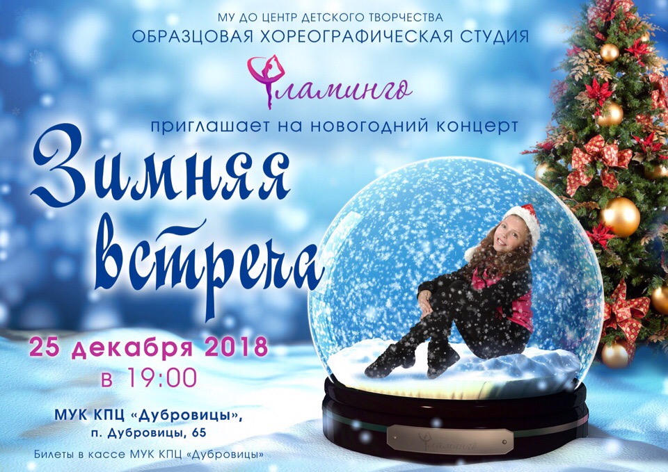 От имени Деда Мороза, Снегурочки и нашей студии спешим пригласить Вас на Новогодний концерт «Зимняя встреча», который состоится 25 декабря 2018 года в 19:00 на сцене МУК «КПЦ «Дубровицы», по адресу: п. Дубровицы, 65. 🎄