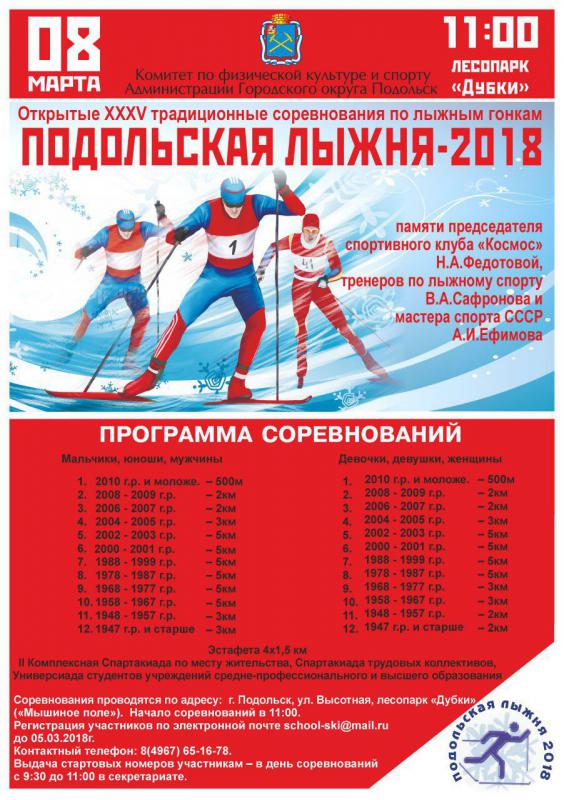 8 марта пройдут Открытые XXXV традиционные соревнования по лыжным гонкам "Подольская лыжня-2018" памяти председателя спортивного клуба "Космос" Н. А. Федотовой, тренеров по лыжному спорту В. А. Сафронова и мастера спорта СССР А. И. Ефимова.