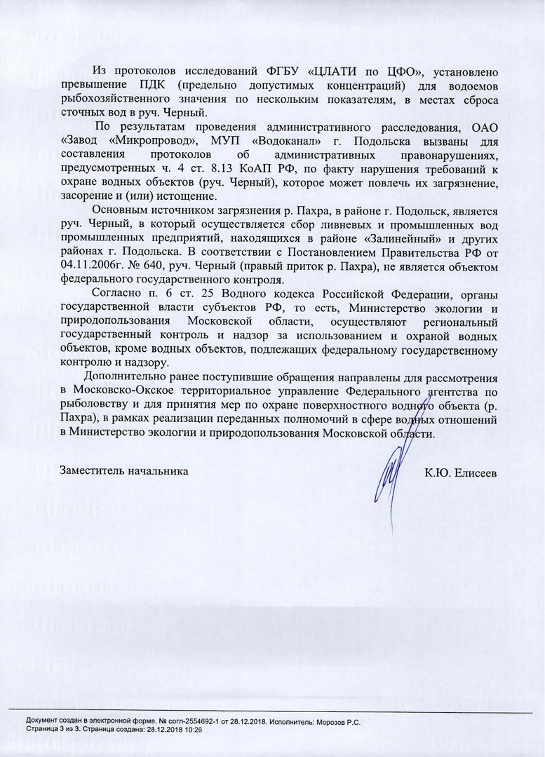 В ходе проверок органами прокуратуры, Московско-Окским управлением Росрыболовства установлено, что гибель рыбы произошла из-за сбросов неочищенных и необезвреженных стоков в реку Пахру от устья реки Черный ручей.