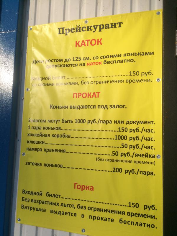 катка для взрослых составит - 250 рублей на весь день, для детей до 7 лет бесплатно; ледяной горки - 100 рублей на весь день; прокат ледянок - 100 рублей за 3 часа, 50 рублей каждый последующий час;