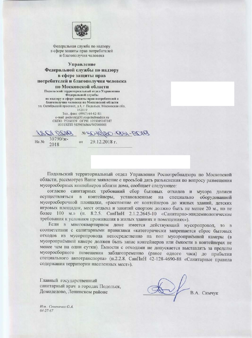 Такие нарушения сплошь и рядом. На Кирова 7 стоит мусорка рядом с фасадом, что является прямым нарушением закона о благоустройстве. МУЖРП-5 сначала писало, что это контейнеры подготовлены на за час до приезда мусорной машины. Но по факту эти контейнеры там стоят всегда. Далее по телефону госадмтехнадзор сказал, что контейнеры не влезают в специально оборудованное помещение и это вообще не контейнерная, если она не благоустроена. Далее я написал в роспотребнадзор, где явно сказано что тут грубое нарушение санитарных норм. Администрация развела руками и выдала такое:летучка писал(а): ↑22 янв 2019 12:57https://dobrodel.mosreg.ru/claims/2345794Подольск, ул Маштакова, д 5Б