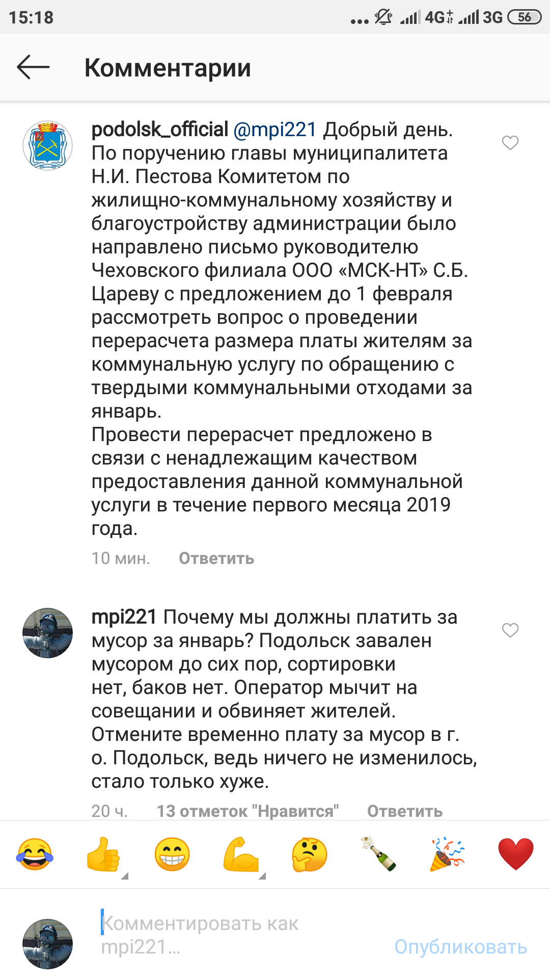 Сработалолетучка писал(а): ↑01 фев 2019 13:52http://www.podolsk.ru/news/n32243.htmlПо поручению главы городского округа Подольск Н. И. Пестова комитетом по жилищно-коммунальному хозяйству и благоустройству администрации было направлено письмо руководителю Чеховского филиала ООО «МСК-НТ» С. Б. Цареву с предложением рассмотреть вопрос о проведении перерасчета размера платы жителям за коммунальную услугу по обращению с твердыми коммунальными отходами за январь.