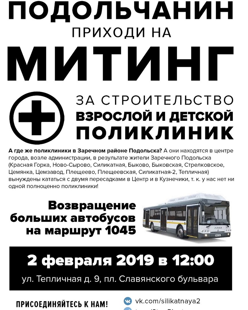 завтра в субботу в 12:00 на Тепличной улице д.9 площадь Славянского бульвара состоится митинг за строительство поликлиники и за возвращение НИЗКОПОЛЬНЫХ автобусов 1045 большой вместимости