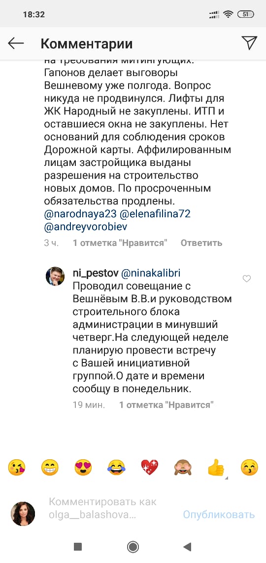 В сложившейся ситуации просим Вас срочно провести совещание с дольщиками 15 февраля 2019 года. Повторные встречи с Вешневым В.В. в сопровождении Гапонова П.В. не целесообразны. Дольщики намерены проводить митинги, акции, обращаться в следственные органы по причине бездействия и возможной заинтересованности должностных лиц, привлекать к проблеме СМИ. Так как терпение граждан исчерпано.
