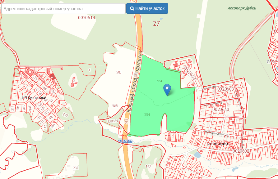 Два земельных участка (50:27:0000000:584, 50:27:0000000:585) категории "земли населенных пунктов", вида разрешенного использования "для сельскохозяйственного производства" разделены автодорогой "Южный обход Подольска".