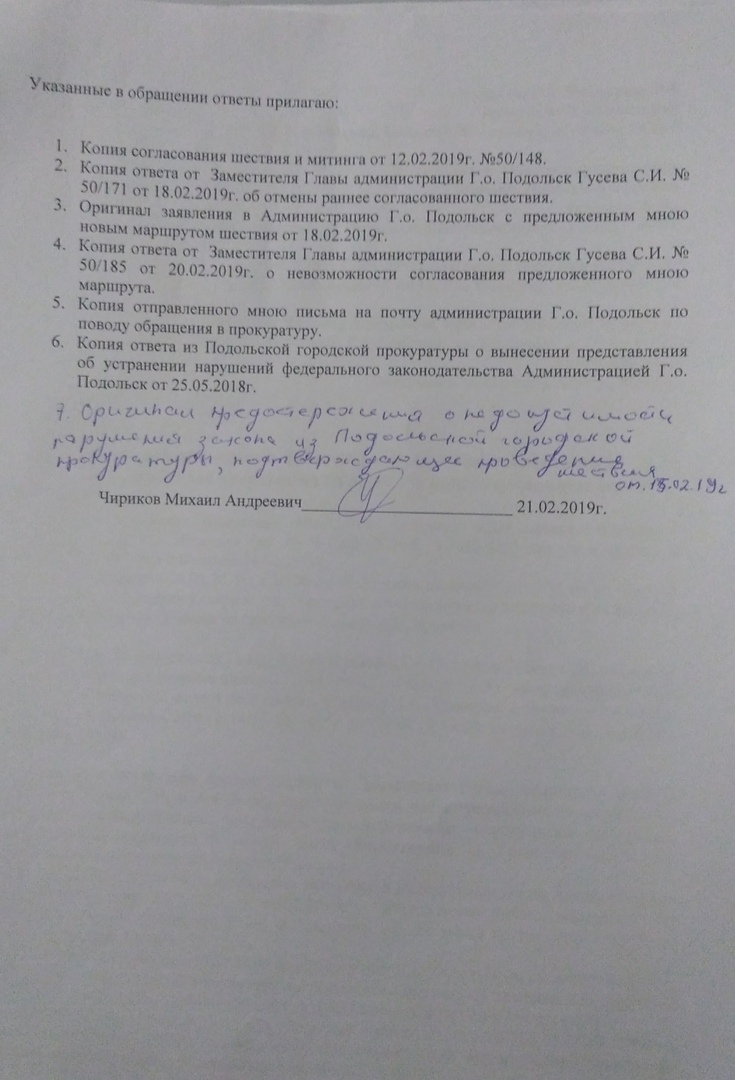 Я, Чириков Михаил Андреевич, 10.02.2019г. отправил через интернет-приемную Администрации Г.о. Подольск (вх. № Ч-1202/12 и № Ч-1203/12 ) два уведомления о проведении митинга и шествия 24.02.2019г.