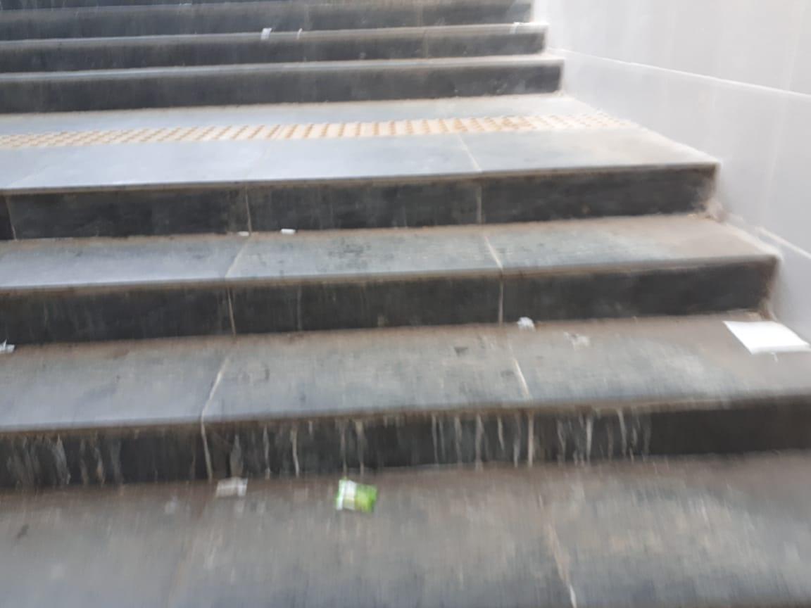 Потолок в отремонтированном переходе течет, желтой инвалидной плитки уже нет, одна гранитная ступень на лестнице отвалилась.