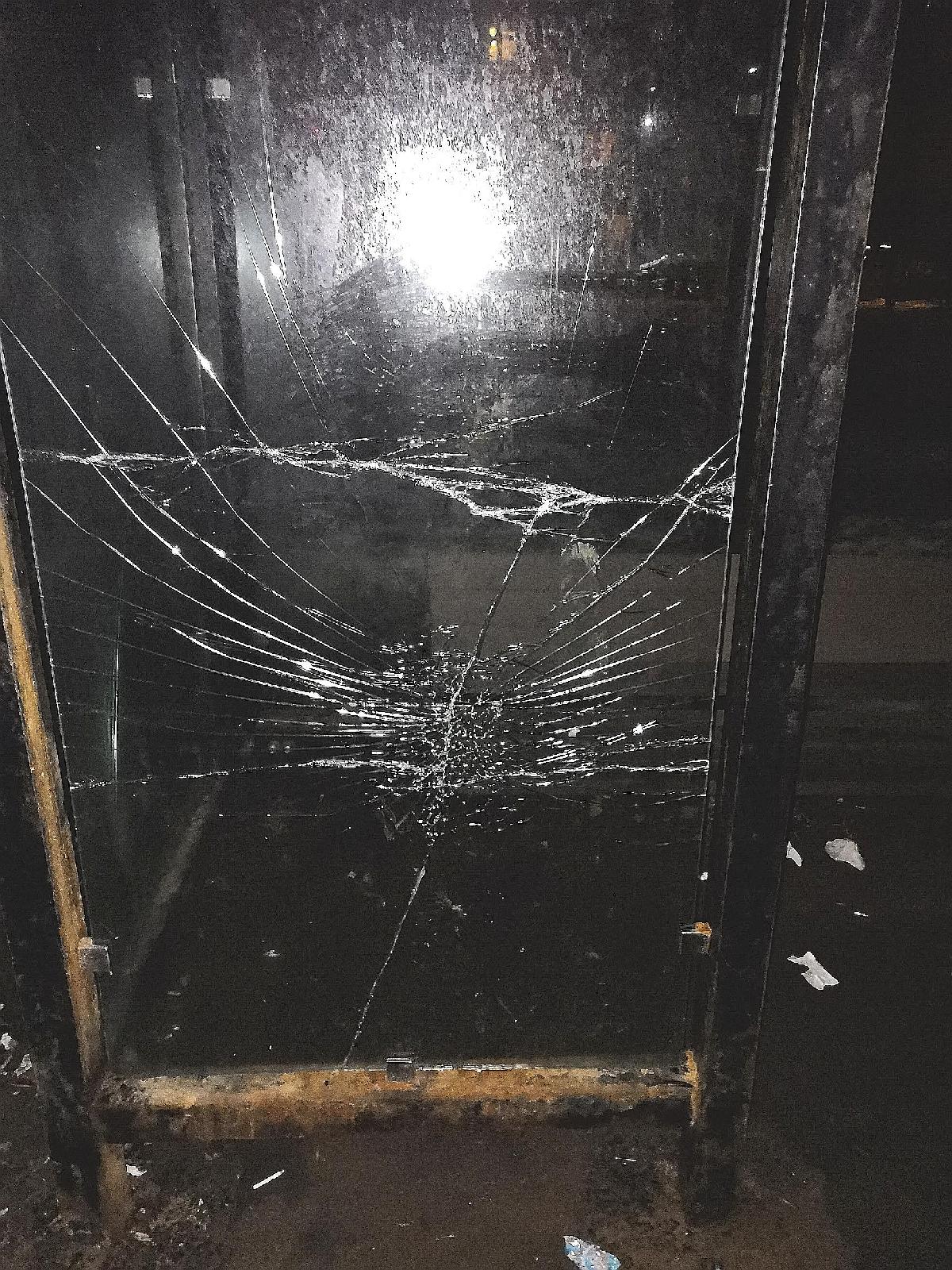Автобусная остановка маршрута 13 около магазина Дикси. Разбито стекло.