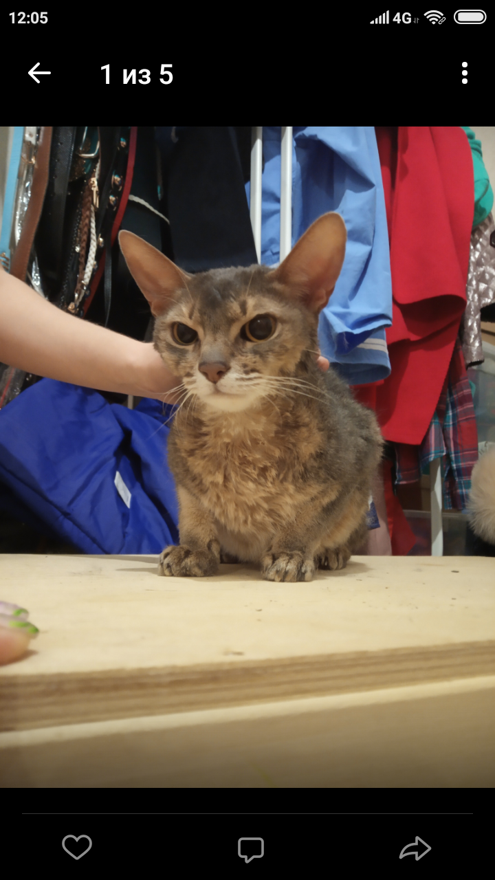 Найдена кошка! На улице.ген.Варенникова под машиной. Серо-рыжая с розовым носом. Очень похожа на абиссинскую. Некрупная. Ищу бывших или новых хозяев. Кошка молодая. Мне кажется, до года. Контактная. Очень красивая, фото не передает. Глаза от янтарного до желто-зеленого цвета. Долго держать не смогу.