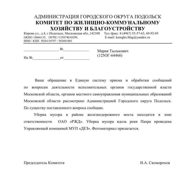 Загрязнение реки Пахры было зафиксировано в середине октября и привело к массовой гибели рыбы не только в Подольске, но и в Ленинском районе, а также в городском округе Домодедово. Данным вопросом занялись сотрудники администрации округа, Московско-Окского территориального управления федерального агентства по рыболовству, министерства экологии Подмосковья и другие ведомственные структуры.