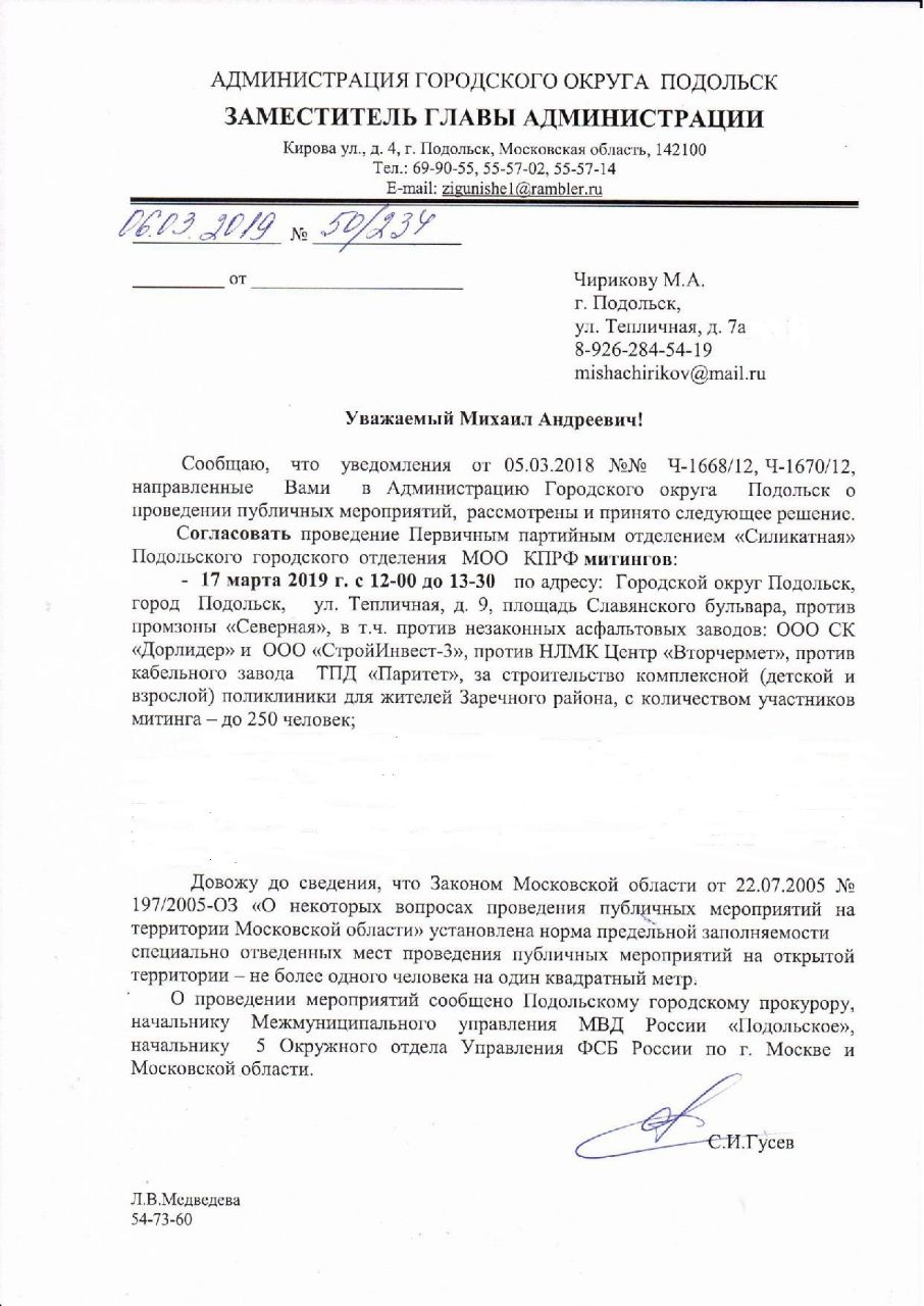 12.02.2019г. от Заместителя Главы Администрации Г.о. Подольск Гусева С.И. я получил согласование на проведение шествия 24.02.2019г. с 14:00 до 14:30 часов по адресу: от д. 31 по ул. Кирова («М-видео) до площади Генерала А.С. Еремеева, а также согласование митинга 24 февраля 2019г. с 14:30 до 16:00 часов на площади генерала А.С. Еремеева (приложение 1).