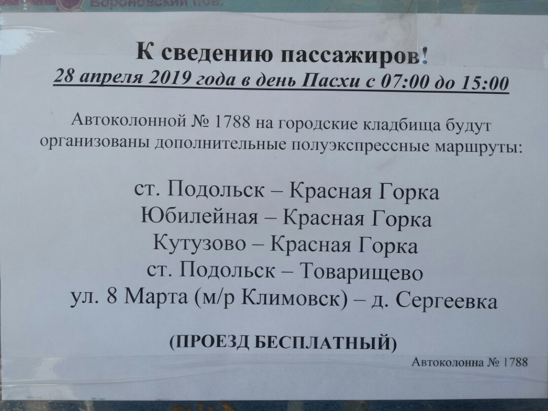 Когда мне попалось сиё объявление на ст. Подольск, то по поводу маршрута "ул. 8 Марта (м/р Климовск) - д.Сергеевка", мне вспомнилось, что, например, моя знакомая ездит на кладбище у д.Сергеевка не из Климовска. (Хотя, кому-то и на Красную Горку, наверное, нужно не из микрорайонов Центральный, Парковый, Юбилейный, Юго-Западный, Фетищево, Кутузово).