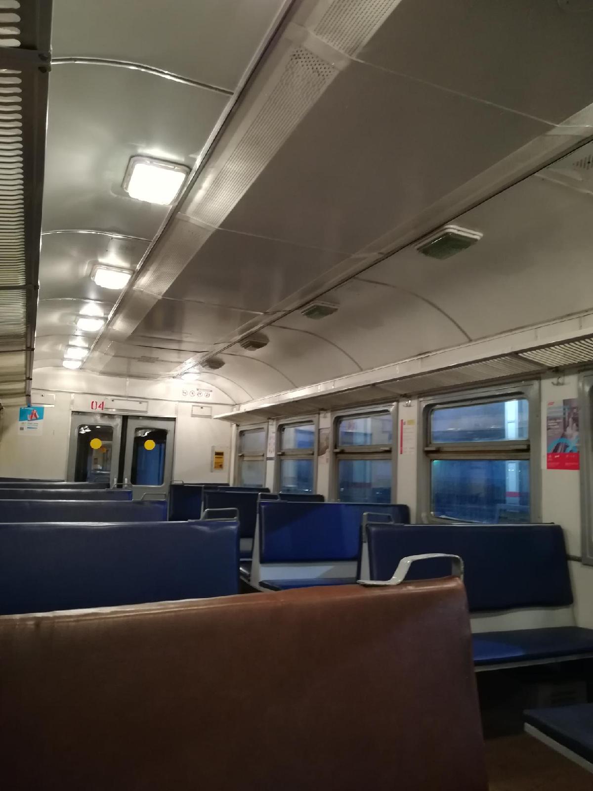 Электропоезд 6458 Подольск-Новоиерусалимская. Неудовлетворительное санитарное состояние салонов; загрязнено межкресельное пространство, грязные окна. Неисправно освещение в вагоне №4.