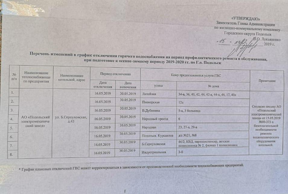Согласно письму АО «Подольский электромеханический завод» о безотлагательной необходимости ремонта теплотехнического оборудования котельной, внесены изменения в график отключения горячего водоснабжения на период профилактического ремонта и обслуживания при подготовке к осенне-зимнему периоду 2019-2020 гг. в Городском округе Подольск.