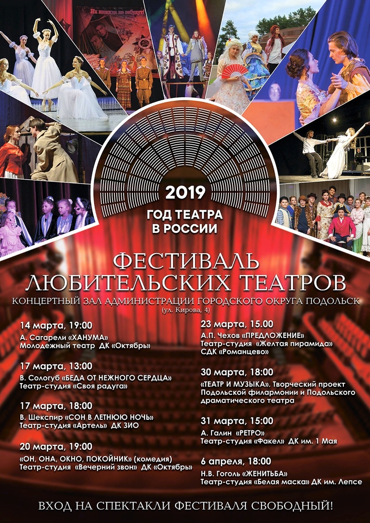 В рамках фестиваля любительских театров «В гостях у Мельпомены» и Года театра в России. Творческий проект Подольской филармонии и Подольского драматического театра «Театр и музыка». Концертный зал Администрации: Подольск, ул. Кирова, д. 4,