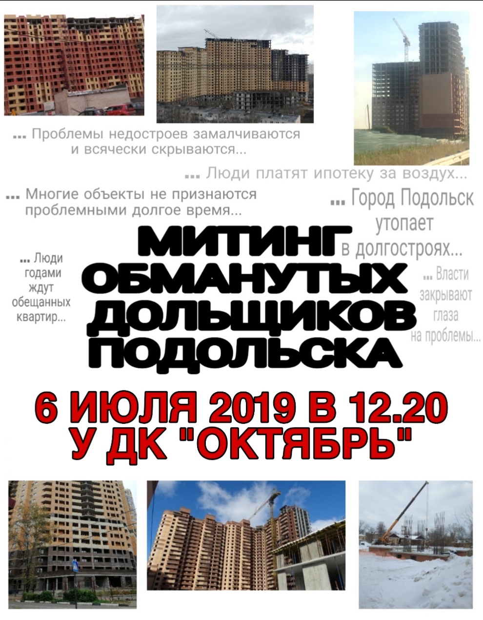 Митинг в поддержку обманутых дольщиков г.о. Подольск состоится 06.07.2019, в субботу, в 12.20 возле ДК ОКТЯБРЬ.