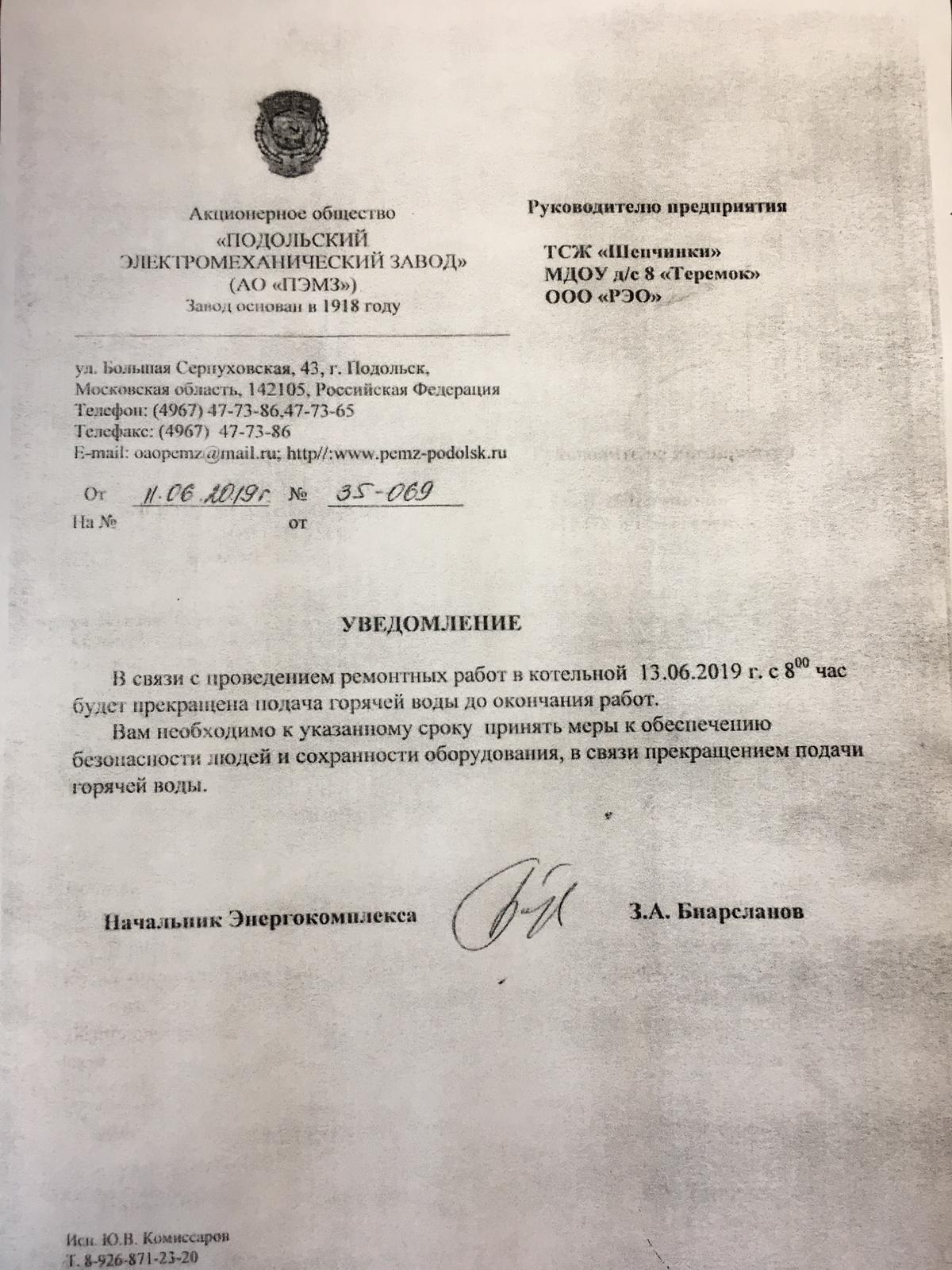 Да уж «ИНФОРМИРОВАНИЕ» у на всегда заблаговременное. Письмо ООО «Эврика-2» от 22 мая и горячую воду отключили тоже 22-го... А ведь в исходном графике (дата утверждения в котором отсутствует) указан период с 1 по 15 июля (см. сообщение Летучки от 08.05.19).