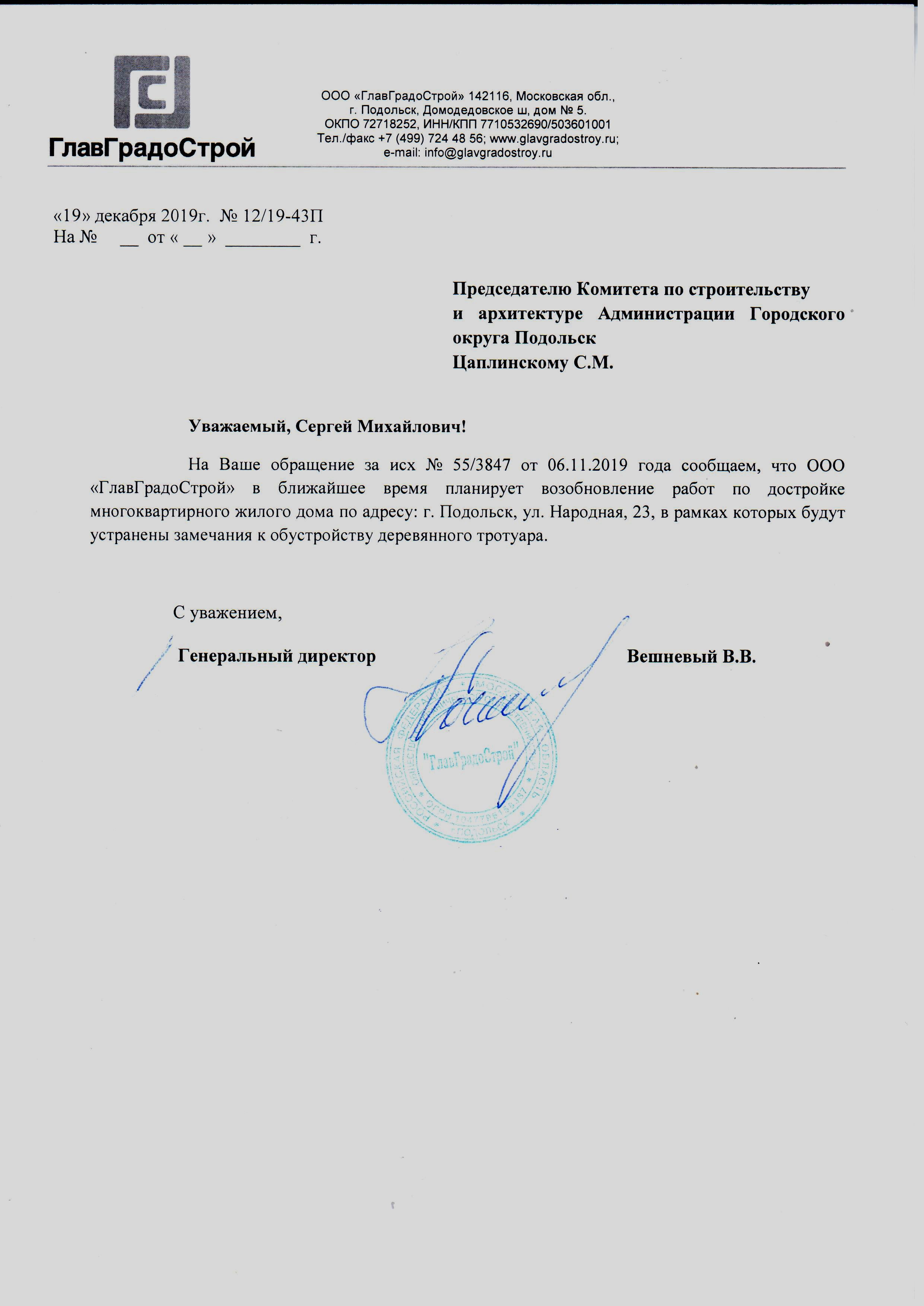 28 ноября 2019 год. Требуем внимания властей г.о. Подольск к застройщику ООО ГлавГрадоСтрой. Директор Вешневый Виктор Васильевич