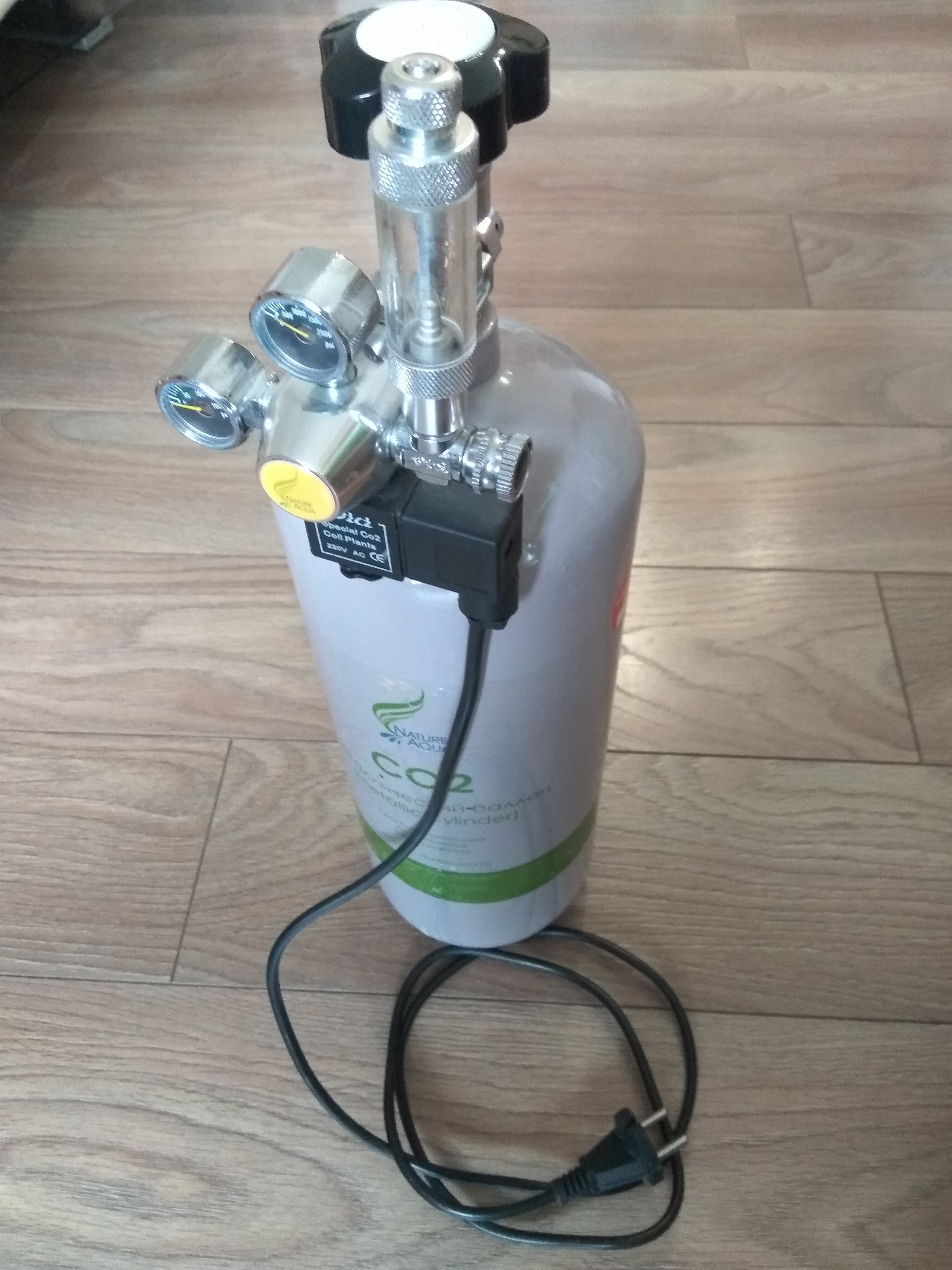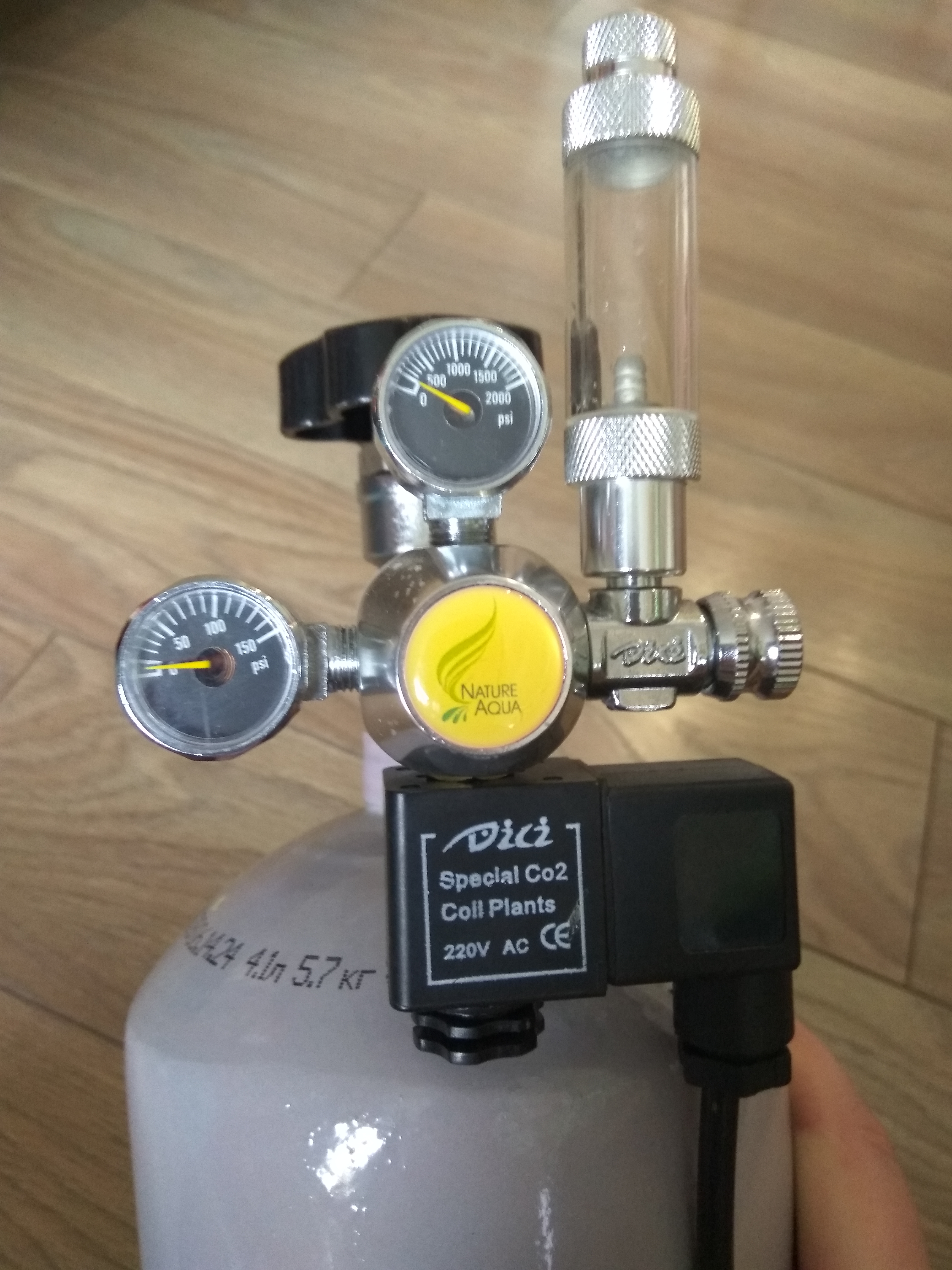 1. Комплект для подачи СО2 в аквариум фирмы Nature Aqua. Баллон 4.1л 5.7кг (можно сказать пустой). Редуктор, электромагнитный клапан, счётчик пузырьков, клапан тонкой регулировки подачи. Распылителя нет, т.к. подавал иглой на вход внешника - 6000р
