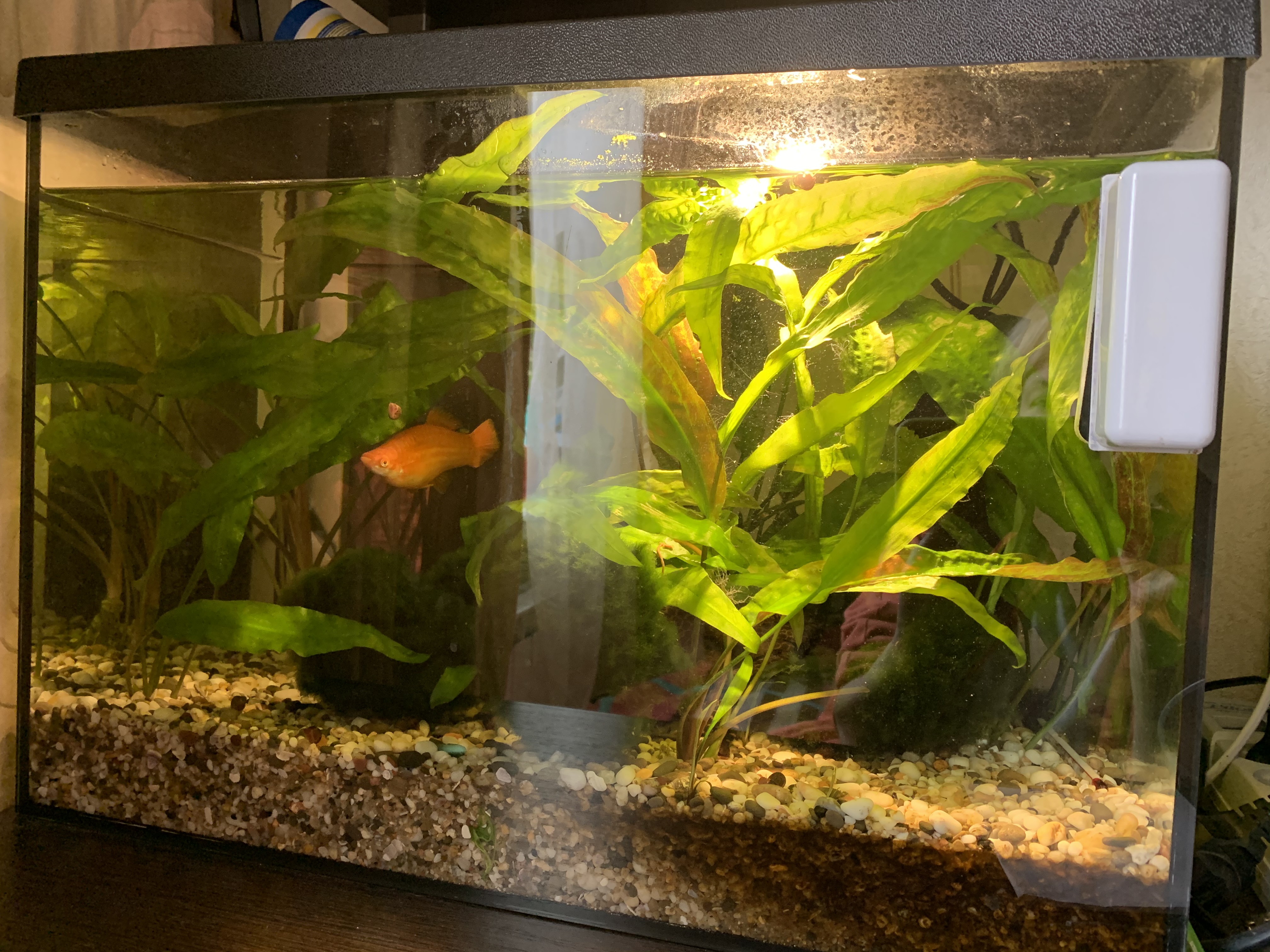 В аквариуме 2 коридораса золотистых, 2 сомика и несколько гуппи. Коряги, кокос и искусственные растения.