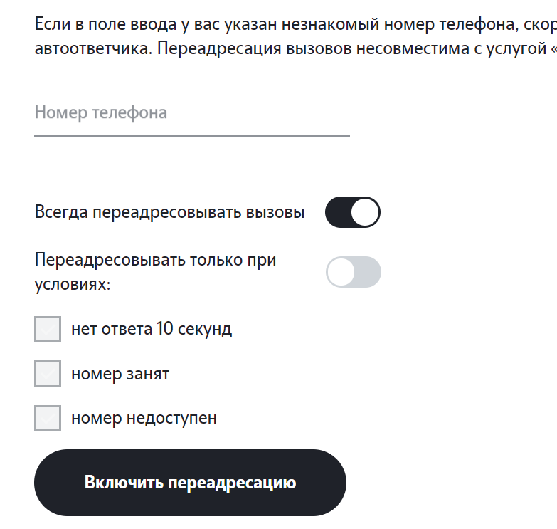 У меня на странице переадресации два ползунка (всегда переадресовывать и переадресовывать при опр. условии), выключаю один - автоматически включается другой. При этом внизу висит кнопка "Включить переадресацию". Т.е., надо понимать, она таки отключена.