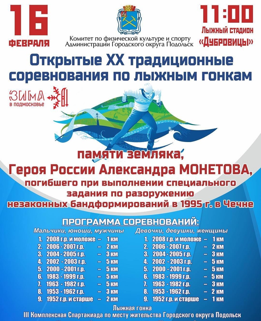 16 февраля пройдут Открытые ХХ традиционные соревнования по лыжным гонкам памяти земляка, Героя России Александра Монетова, погибшего при выполнении специального задания по разоружению незаконных бандформирований в 1995 г. в Чечне. В ходе данного спортивного мероприятия также пройдут состязания по лыжным гонкам в рамках III комплексной спартакиады по месту жительства городского округа Подольск. Место проведения - лыжный стадион "Дубровицы".