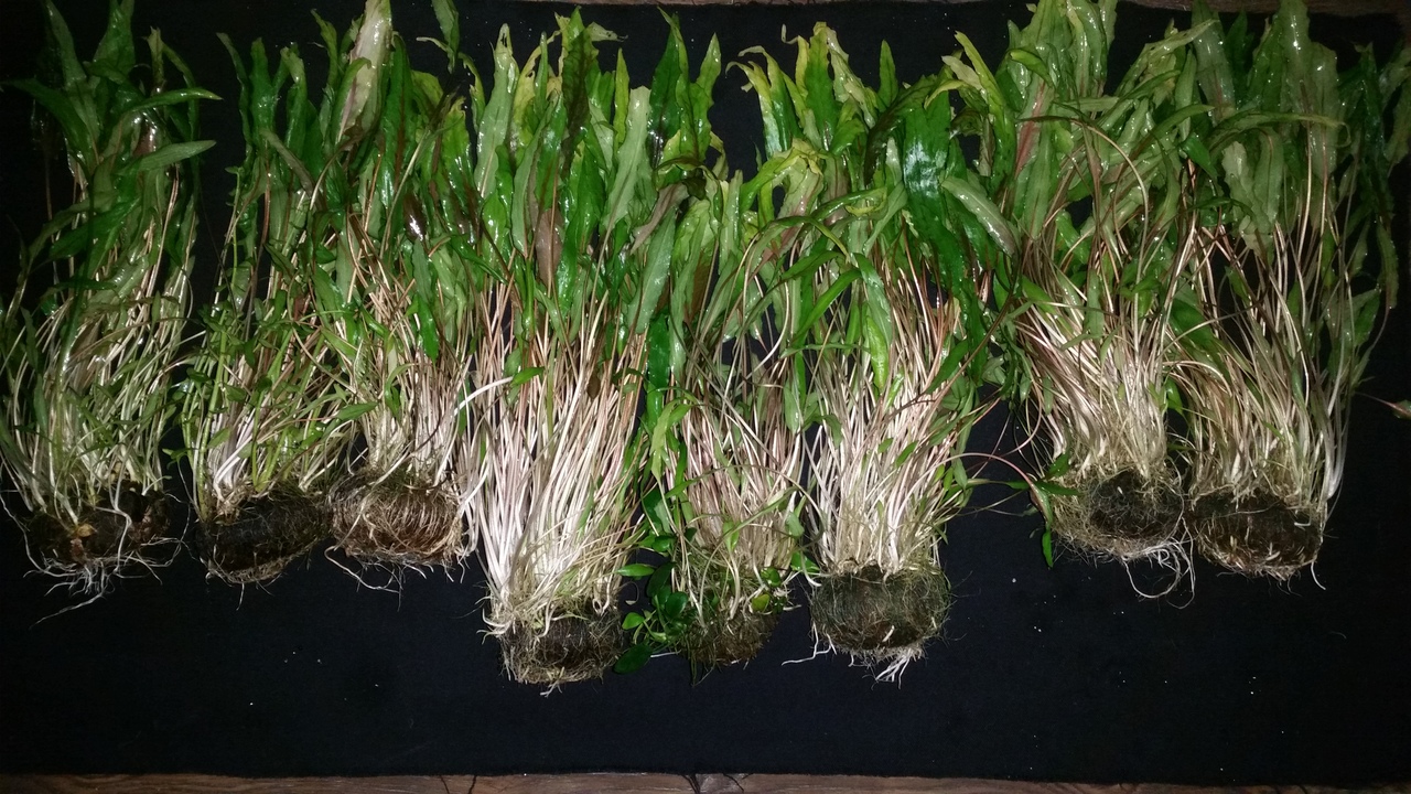 Папоротник Тайландский. Насколько помню корни его заглублять в грунт вообще не стоит, а привязать, например, как у анубиаса. Да, и что-то в подольской воде он у меня помнится хворал..