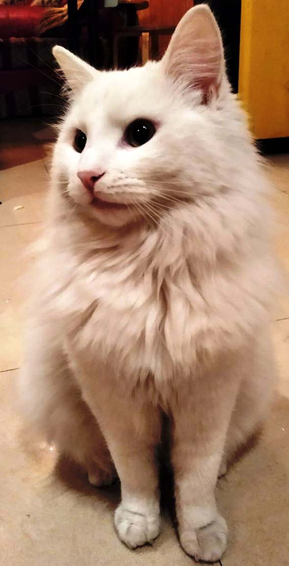 Похож на белое облачко. Котик домаший. Кастрированный. Ему 1,5-2 года. Общительный, добрый, совсем не царапается.