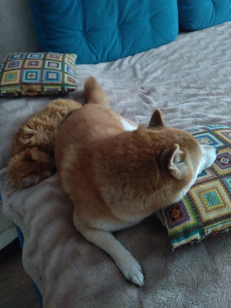 Утром каждый раз уговорить не могу пойти гулять ! В ответ урчание ворчание и закапывание поглубже в одеяло! Привыкла за каникулы, что рано вставать не надо и в 7-45 у нее самый сон! А Таро как всегда - чем ближе папа ,тем лучше кобелину! В общем живем дружно , но есть и печальные известия. Ушел мой серый кот мой мудрый Мусь- 20 лет с нами прожил Даже не думала что так будет тяжело. Смотрю на фото где он есть и слезы на глаза наворачиваются . Хотя понимаю,что 20 лет для кота -это очень хороший возраст