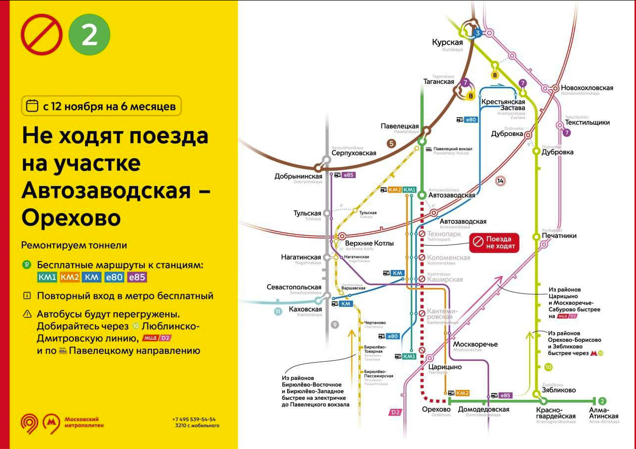 🛠 12 ноября участок между станциями «Автозаводская» и «Орехово» Замоскворецкой линии метро закрывается на ремонт. Добраться до центра можно будет, например, на поездах Павелецкого и Курского направлений.