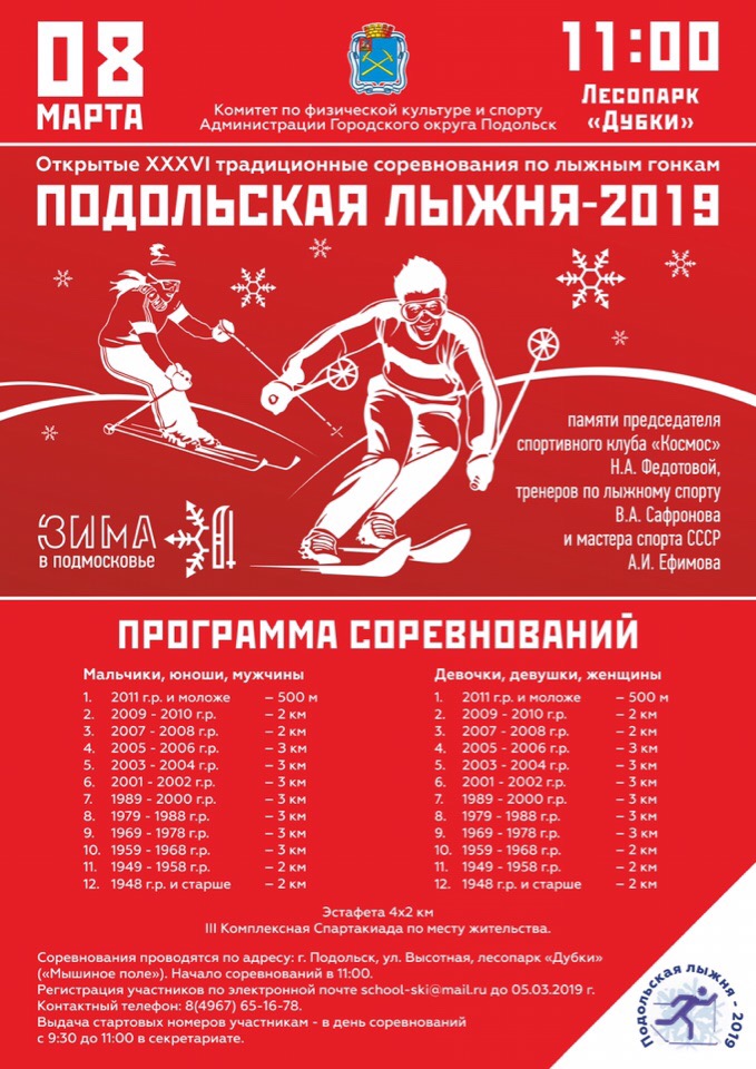 Открытые XXXVI традиционные соревнования по лыжным гонкам «Подольская лыжня» памяти председателя спортивного клуба «Космос» Н.А. Федотовой, тренеров по лыжному спорту В.А. Сафронова и мастера спорта СССР А.И. Ефимова состоятся 8 марта 2019 года, рассказали в Комитете по физической культуре и спорту администрации муниципалитета, подчеркнув, что помимо основных соревнований, запланирована эстафета 4х2 км в рамках III Комплексной спартакиады по месту жительства.
