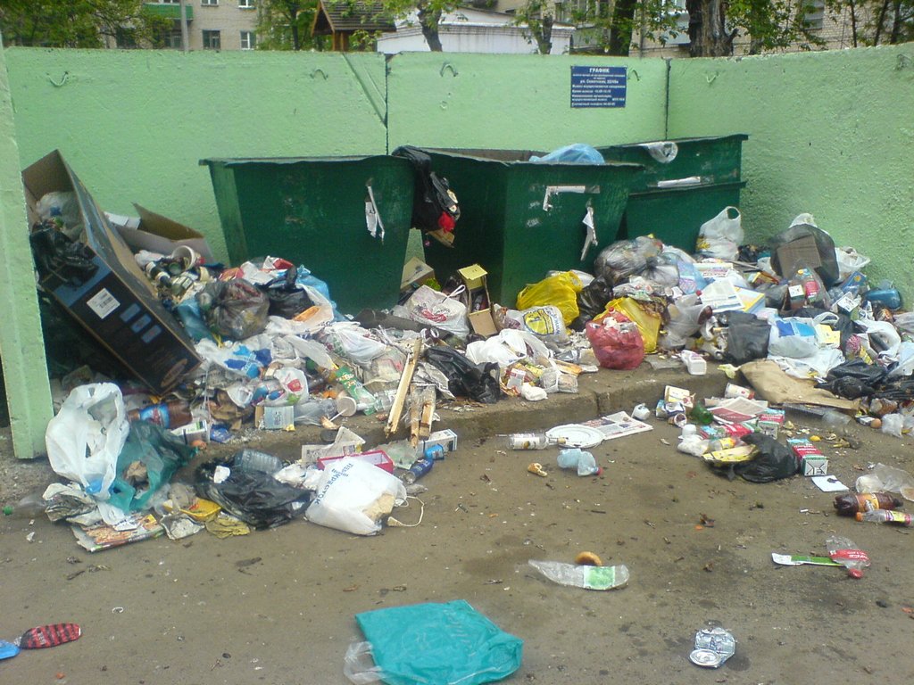 Мусор вывозят редко, после того как мусорка уезжает жители двора каждый раз видят эту картину. Самое весёлое какая гора скапливается до приезда мусорки, но этой фотки у меня нет. ул.Советская д.22\49.